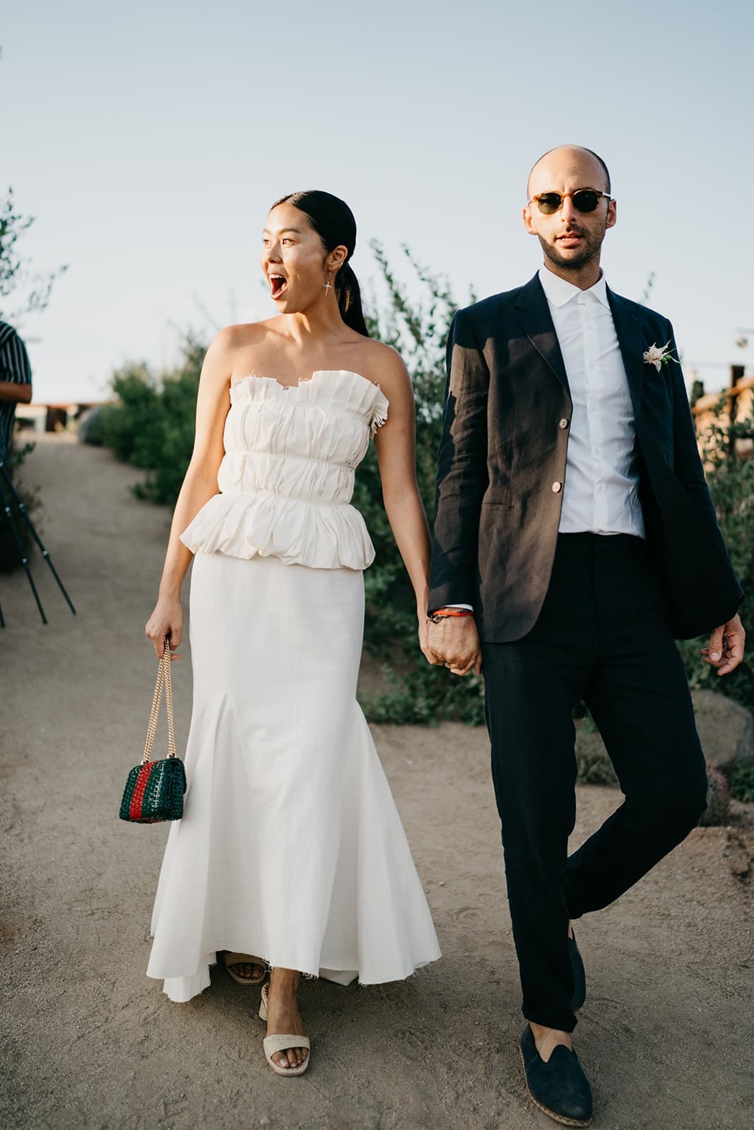 “For the reception, I changed into a linen Brock Collection bustier and skirt. I wanted the shoe to be more casual and have a thicker heel since I would be dancing all night. Earlier in the year, I designed a shoe for Chan Luu in collaboration with Carrie Forbes (they look similar to these). It was a block heel sandal made from Raffia. I did not have my wedding in mind when designing the shoe, but it ended up being perfect for the occasion. I loved the texture mix of the linen outfit and the raffia shoe and thought the materials complemented each other.”