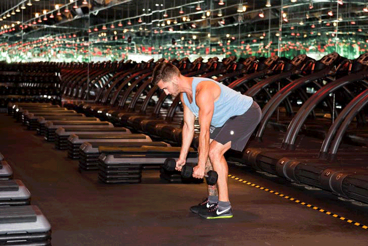“Standing with your feet hip-width apart, bend at your knees and hinge forward at your waist with a flat, neutral spine. Keep your arms straight out in front of you with your palms facing in towards your body. Row (pull) the weights back, making sure your elbows are above your back. Then, straighten your arms as you push the weights back, locking your arms out behind you. Repeat until you can't anymore.”
