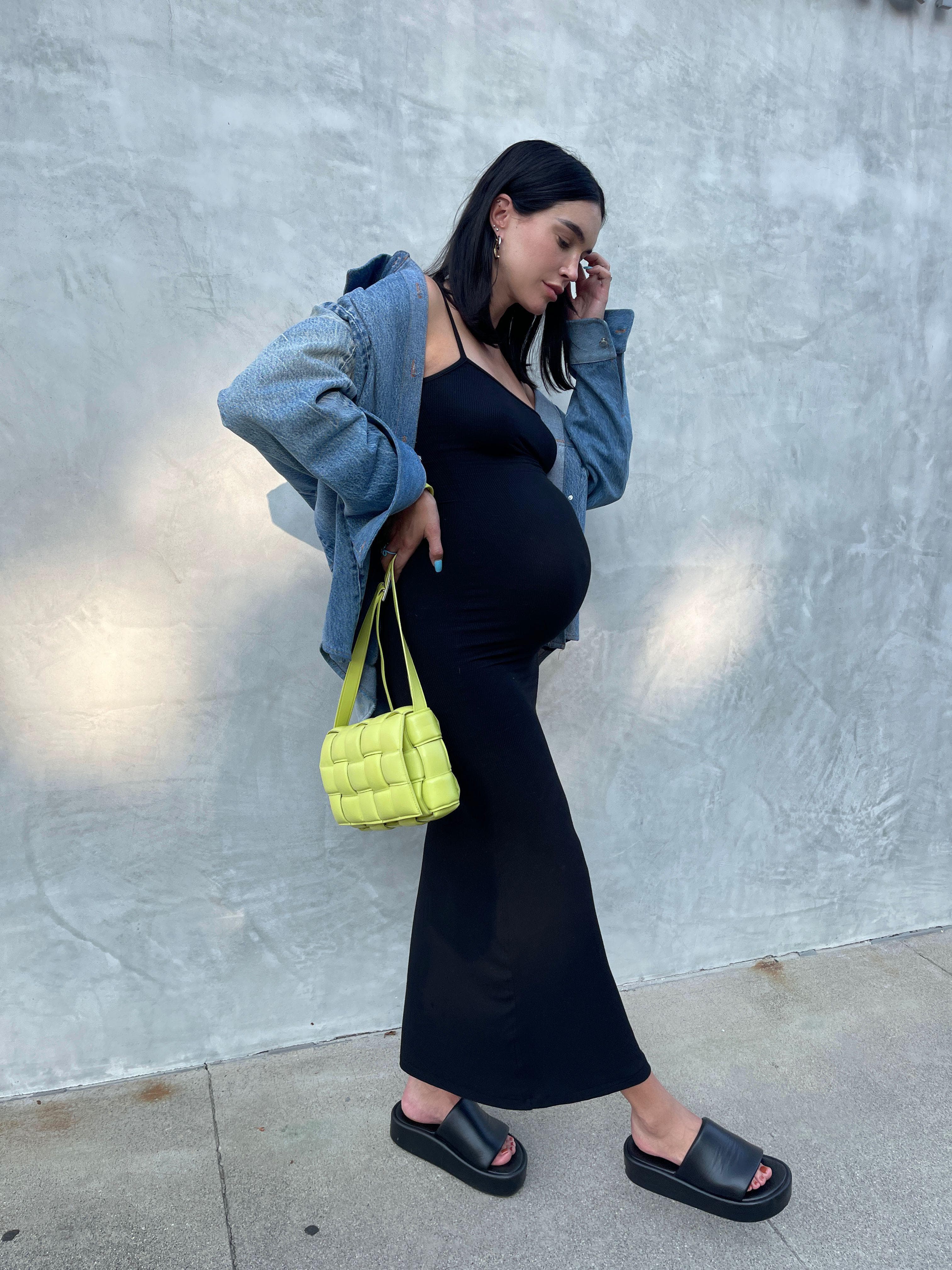 "I'm channeling all my '90s energy into my outfits, which works well for pregnancy because flatforms and simple square-neck dresses have been my go-to. Luckily, because it's back in style for retailers, these items have been easier for me to come across. I feel fortunate to be pregnant at a time when so many styles of clothing are available that I never felt the need to buy true maternity clothes—I've been able to size up and still make the outfit bump-friendly, which has allowed me to be more creative with my pregnancy style. I'm especially into bright colors and neons this summer."