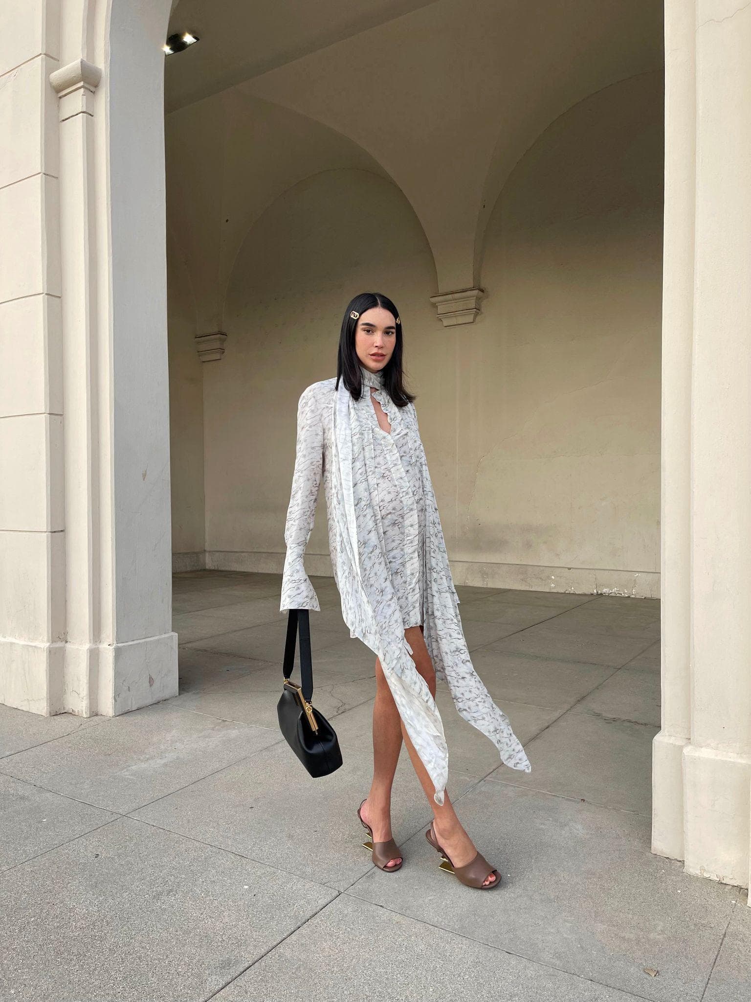 "I recently wore this look on a date night with my husband. I loved how feminine and strong it made me feel with the extra-long sleeve length and how it fell perfectly around my bump (even though it's not a maternity dress). So much of my body is changing during pregnancy, and I love to feel like myself while still wearing something chic and comfortable. I look forward to getting ready for myself, but also dressing up to spend time with my husband, especially because we know our schedules will be so different once the baby is here. I've been really enjoying these last weeks of us having that couple time together and felt that my outfit conveyed that, as well."