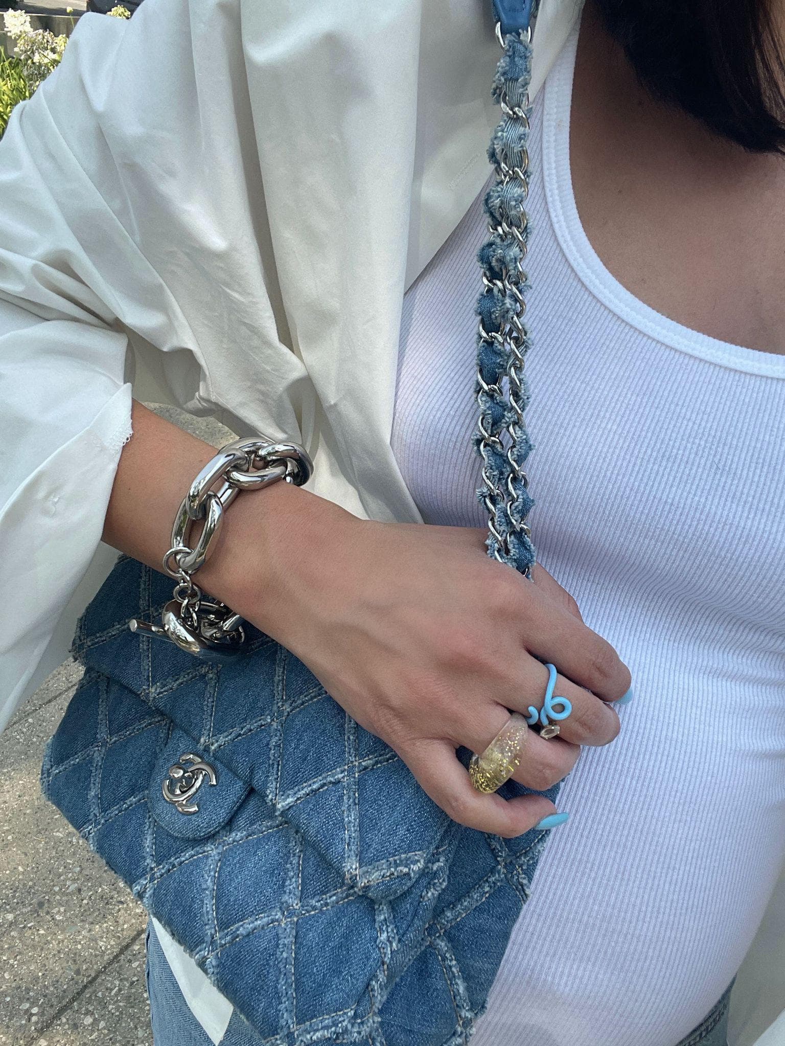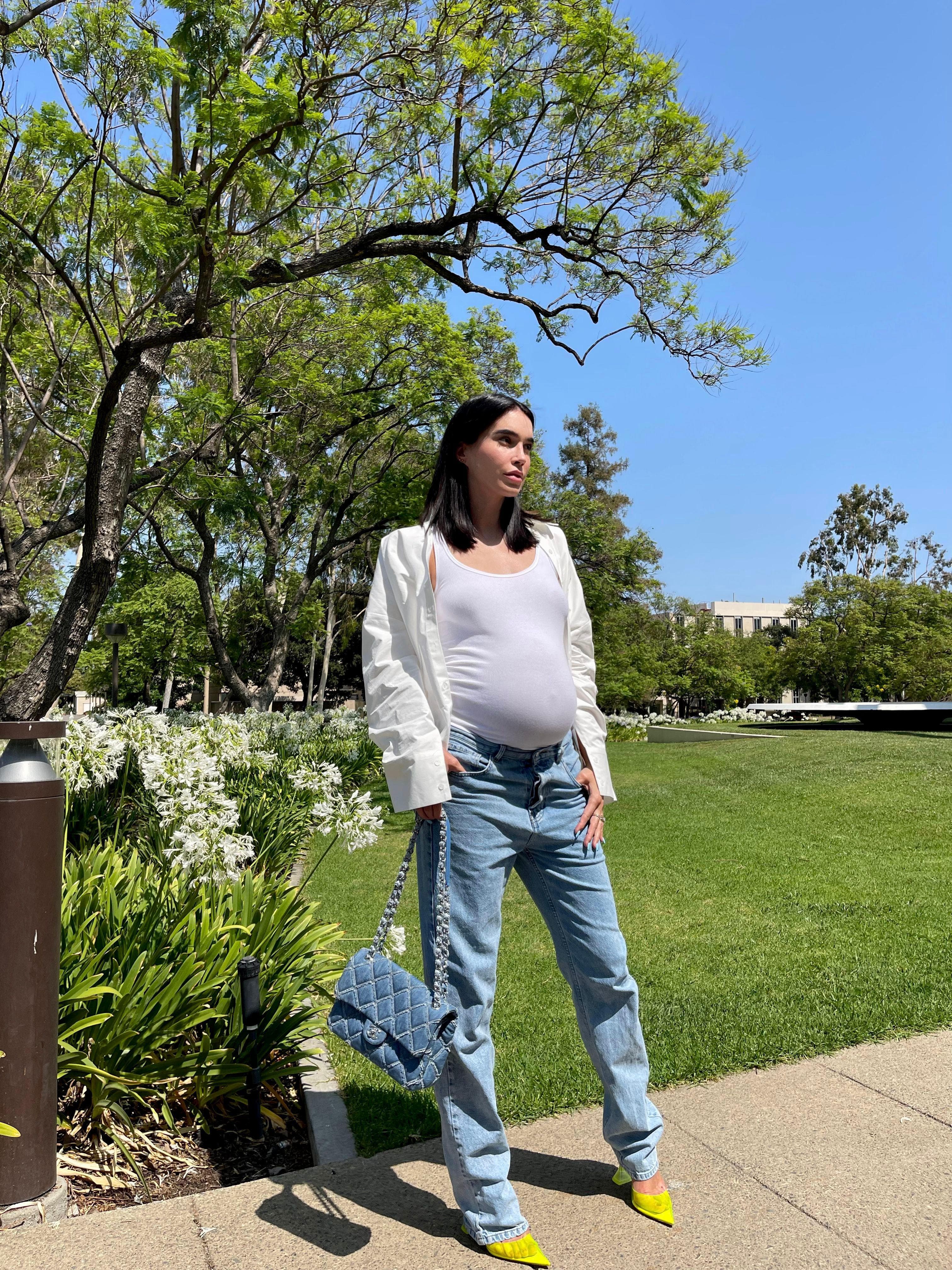 "This look I wore recently to a lunch meeting, and it's actually almost all from my husband's closet. I've always loved wearing his clothes—his t-shirts and shirts are always so soft. Men's jeans have been amazing during my pregnancy, especially when looking for a loose-fitting pair. The rise fits perfectly under my bump. I dressed this casual look up with a few of my favorite accessories, including PVC neon heels."