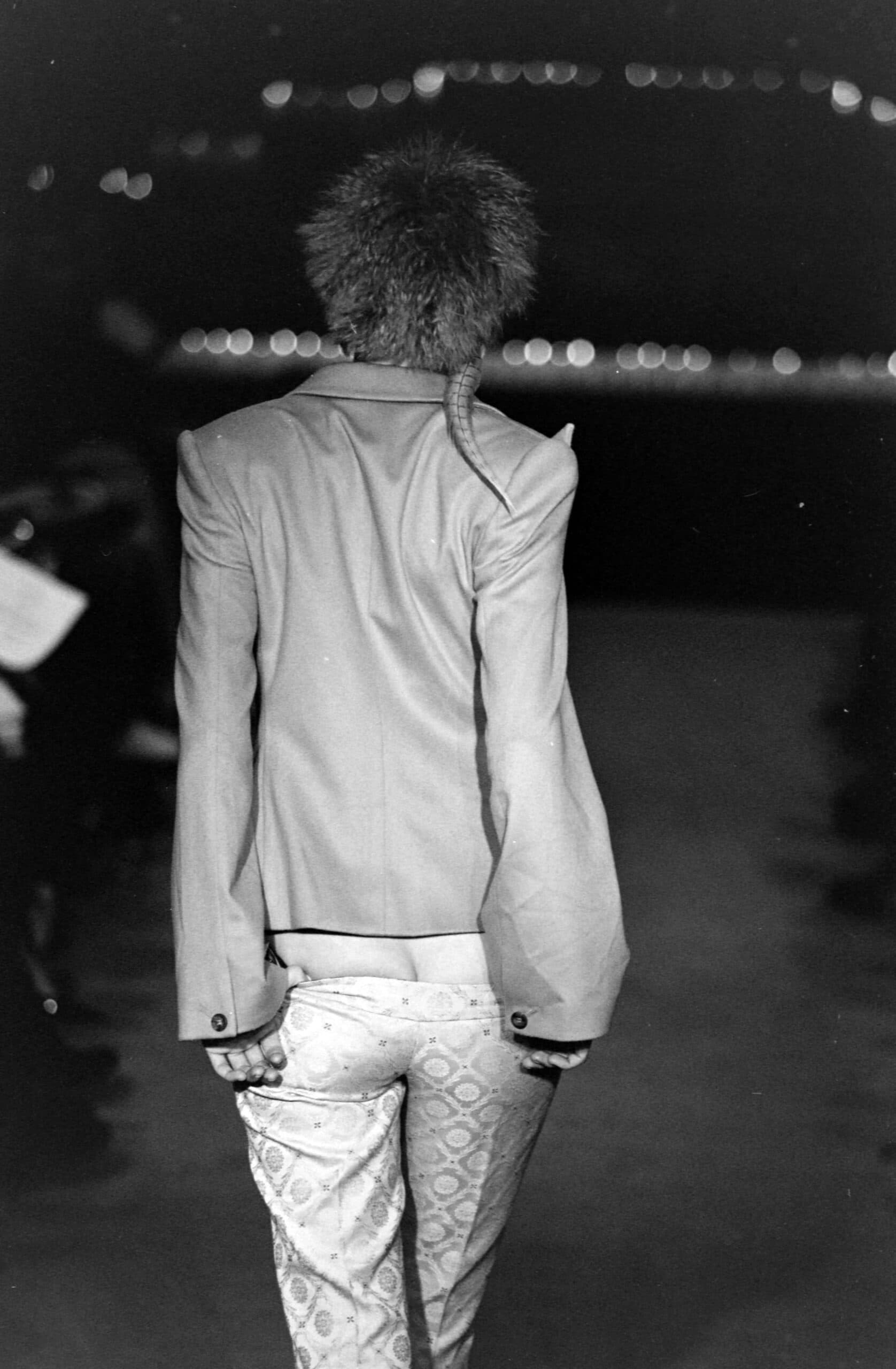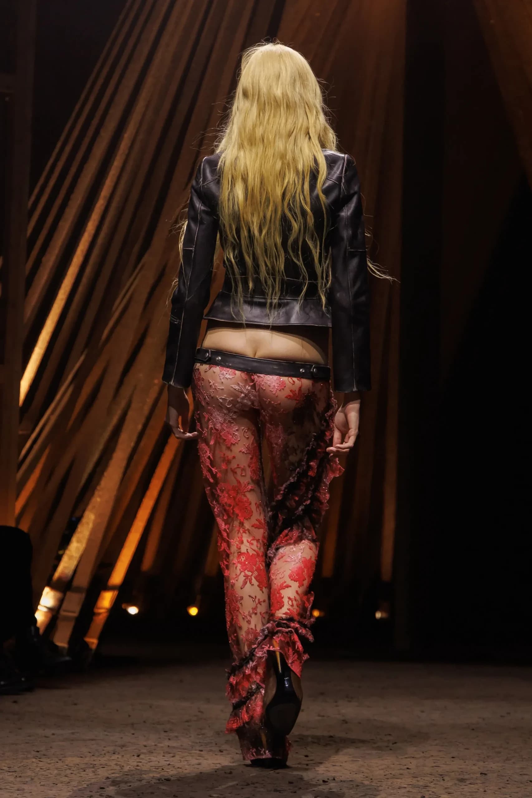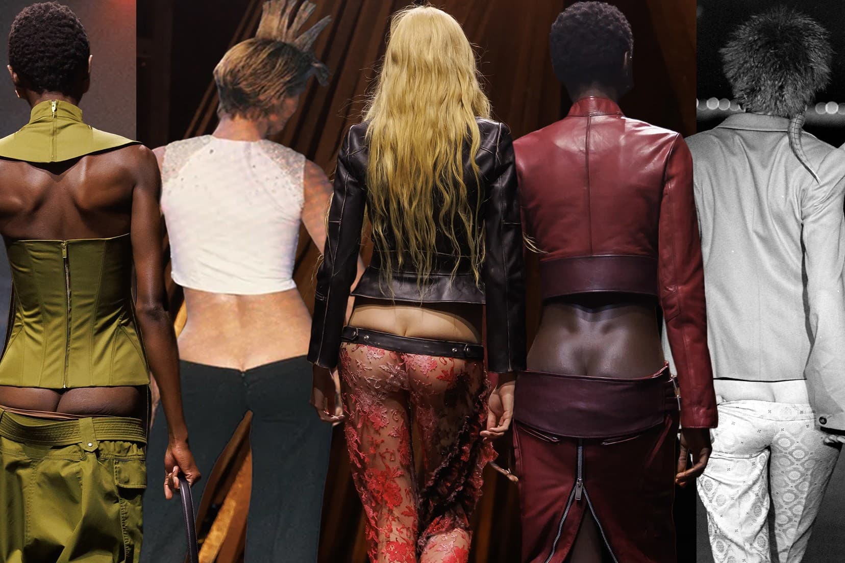 The late McQueen once alluded to the fact that he was inspired by “builders bum"—another nod to his working class upbringing—but later revealed the bumster was more about elongating the figure, and creating sensuality. "It wasn't about showing the bum...To me, that part of the body—not so much the buttocks, but the bottom of the spine—that’s the most erotic part of anyone’s body, man or woman," McQueen told The Guardian after his first collection in 1993. Seduction in fashion is harder to come by these days, as we've been collectively desensitized towards the naked form. Case in point: we saw plenty of full-frontal nudity on the runways in Paris, yet very little of it felt erotically charged. Duran Lantink’s debut Jean Paul Gaultier collection featured printed bodysuits with full-frontal male genitalia, Mugler’s Miguel Castro Frietas sent a model down the runway with a sheath of a dress attached to her exposed nipple rings. Even off the runway, who can forget Bianca Censori’s entirely sheer Grammy’s dress from earlier this year?