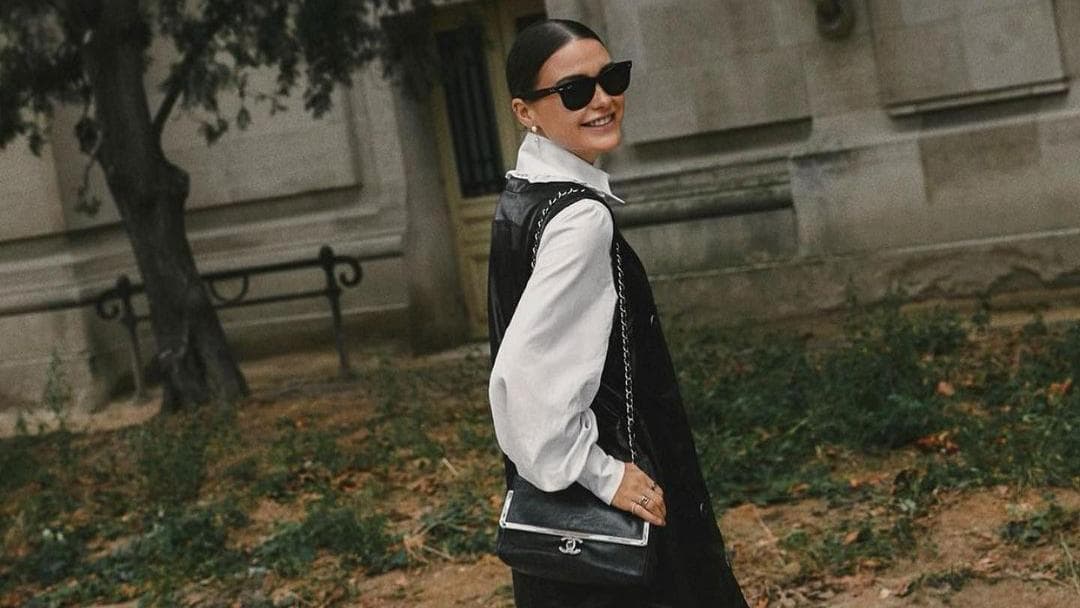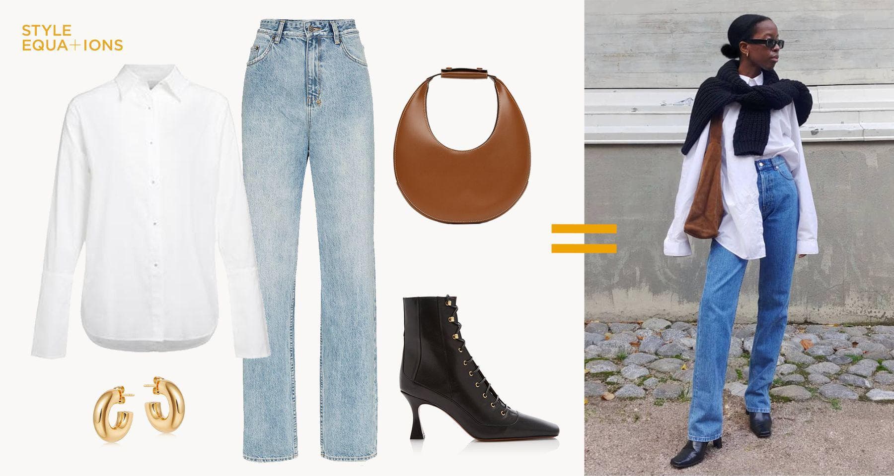 Right photo: Courtesy of Instagram/@sylviemus_The bones of this look are super basic—a button-down and pair of jeans—but we love the preppy-meets-minimalist styling. Drape a sweater over your shoulders and add your favorite pair of trendy sunglasses.