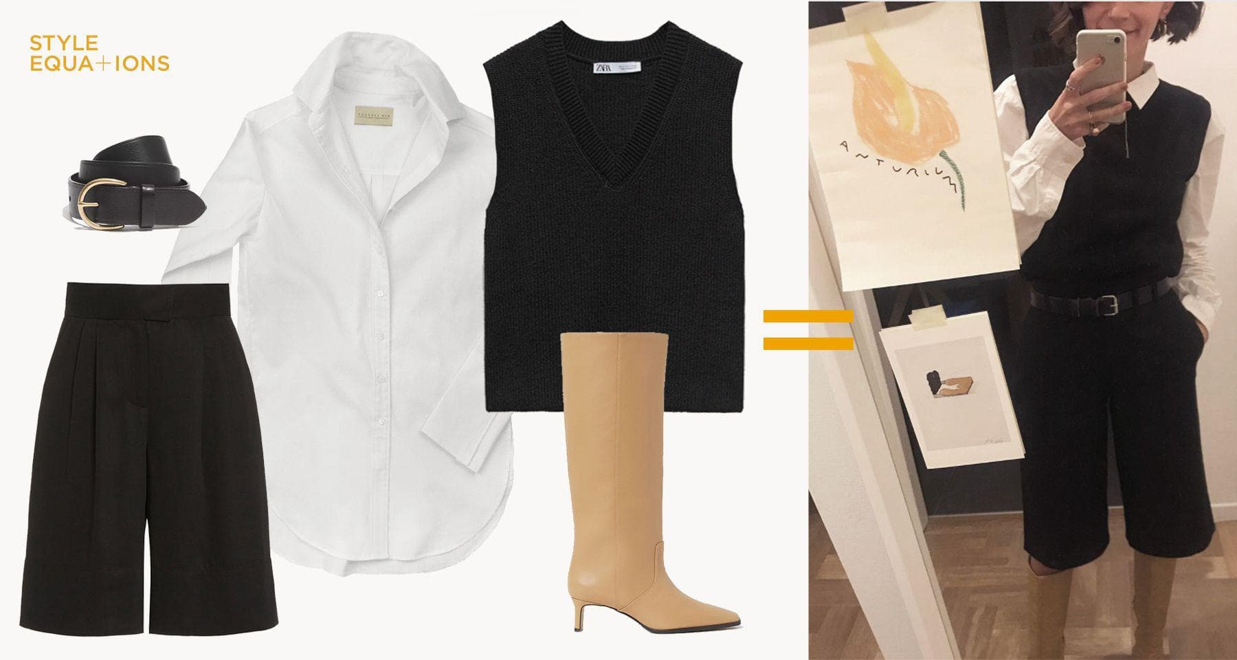 Right photo: Courtesy of Instagram/@federica_gervasoniButton-downs serve as the perfect base for sweater vests—one of our favorite trends du jour. Sleek bermudas and tall boots take this pairing to another level, and don't forget to finish everything off with a simple belt to break up the monotony of color.