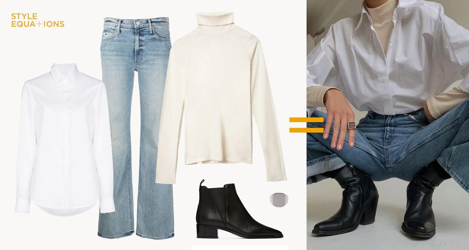 Right photo: Courtesy of PinterestThis simple yet intriguing ensemble reminds us of our love of mixing shades of white. Unbutton your shirt midway and layer it over a cream turtleneck for the full effect. And when in doubt, jeans and black ankle boots will never fail you.