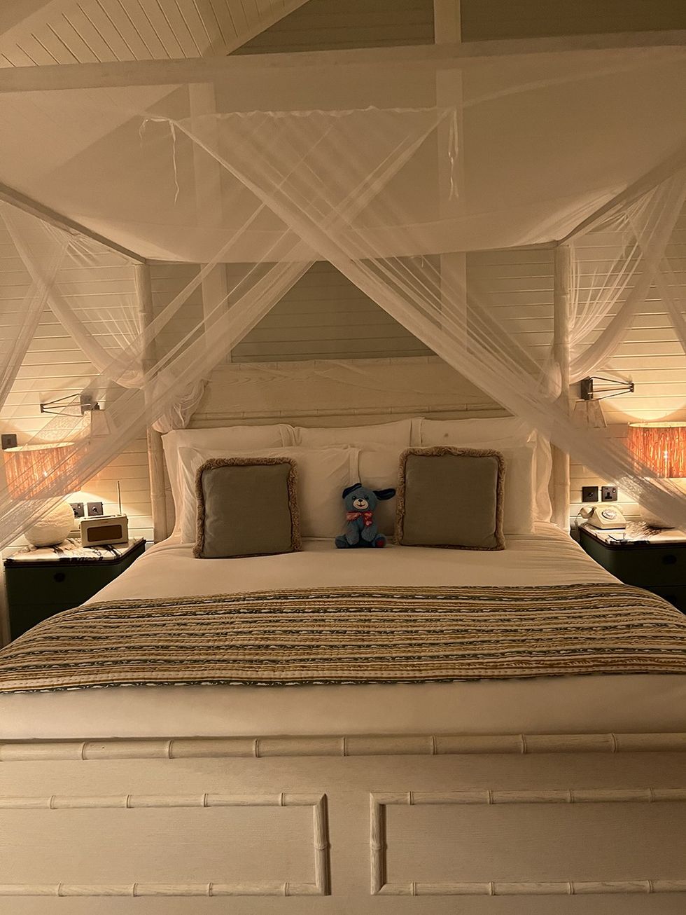 As for us plebs without vacation homes to retreat to? Luckily, there are three (still incredibly luxe) resort and rental options on the island to choose from: the Italian villa-inspired Mandarin Oriental Canouan; Canouan Estate and Villas, which has intimate residences for groups and families; and Soho Beach House Canouan, the breezy and coastal-cool hotel where I’m set to stay. I arrive after a long day of traveling misadventures, including a delayed connecting flight and a brush with the Barbadian law. (Let’s put it this way: The country has made wearing camouflage print illegal and I definitely did not know that when I chose my pants for the flight.) I’m exhausted, hungry, and sticky from a day stuck wearing my cold weather New York clothes in the tropical heat. But I’ve revived the moment I enter my suite. Decorated in wicker furniture and linen touches worthy of a Nancy Meyers movie, a gentle salt air breeze blowing through floor-to-ceiling doors, the room is a serene oasis. I pivot from my original desire to skip dinner with my group and shower, then change into a long, romantic red dress for a candlelit meal on the resort’s private beach jetty.