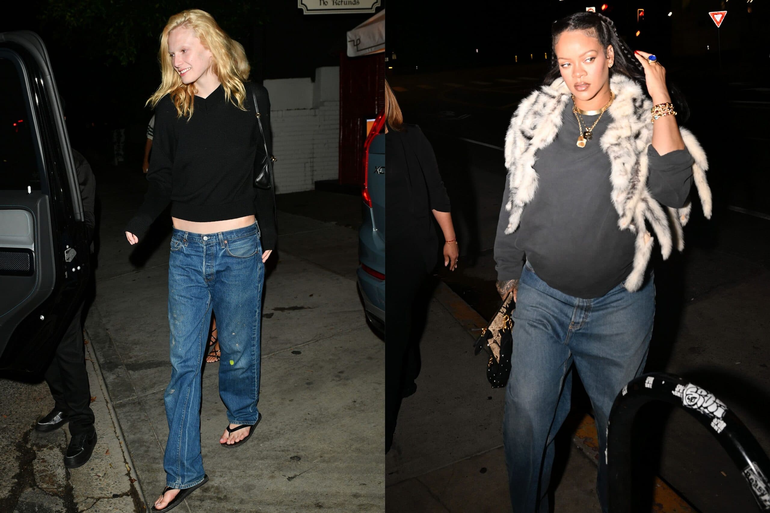 Back in LA, Alex Consani and Rihanna had an accidentally matching moment, stepping out in separate parts of the city wearing slouchy denim jeans and a simple sweatshirt—Consani's was black, Rihanna's grey—while the latter accessorized with a fur stole of sorts.