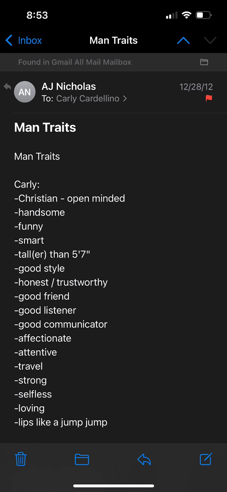 Another thing I believe: that writing down, on paper, exactly what you want in someone and making sure you’re those things as well. Here’s the list I made in 2012, the year I went on my first blind date with Giovanni Vaccaro, my now-husband: