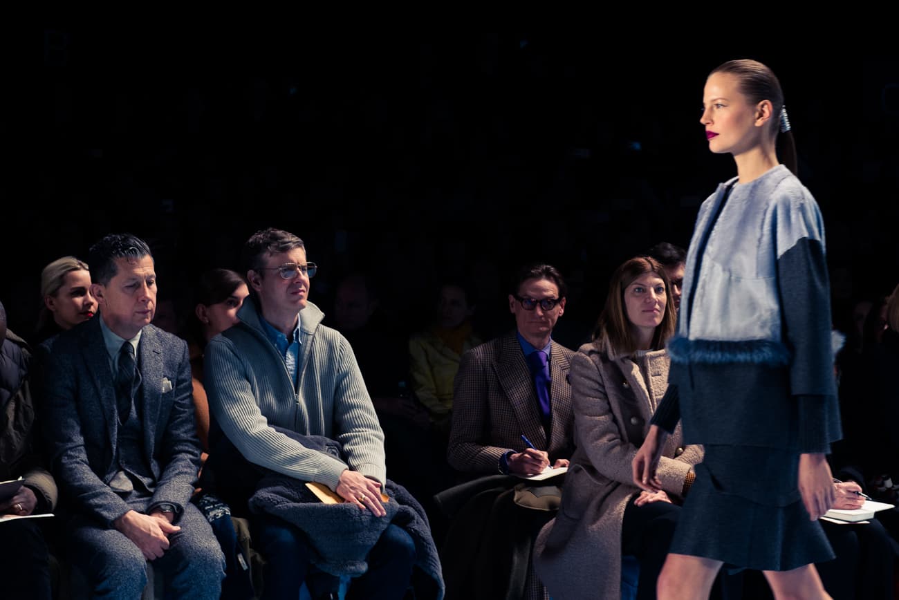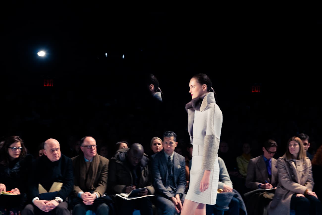 “Our collection this season was based on the light patterns of the sun on water that lead to these beautiful wave shapes and blurred prints,” says Herrera. She worked in a narrowly defined color palette for her Fall 2015 collection; take for example the opening number on Karlie Kloss (so. much. yes.) in silvery blues, and the closing look, a navy gown worn by catwalk crooner Jourdan Dunn; in between, waves of red broke through the 50 shades of blue. And some major props are in order for those fur-trimmed scarves.