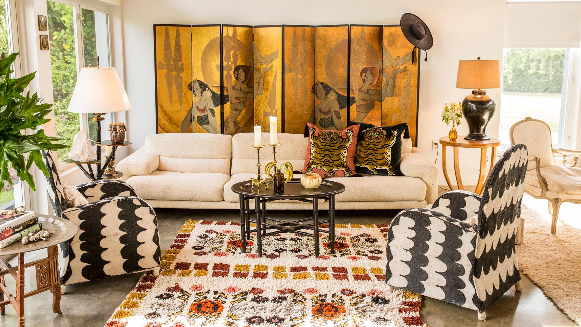 Kleinman began with a plush wool rug, a beige ottoman, and Moroccan pillows. (The family literally slept on the floor the first night in the home.) Instead of forcing the space to be ready in an instant, the designer took her time collecting pieces she connected with. That's why almost every single thing comes with a story—the Peruvian carved gold-leaf frame, hand-beaded African chairs, and tons of embroidered Moroccan pillows. Her space then evolves with the collection, constantly changing to house new discoveries. Continue to discover how Kleinman translated her passion for vintage markets and antiques into this modern Miami space.