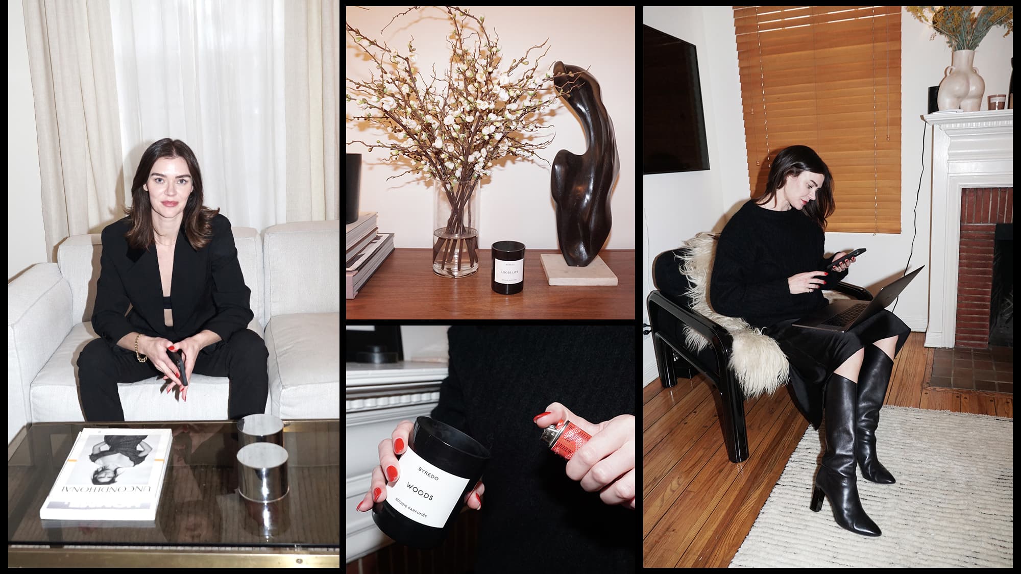 “I fully embraced sweats at the beginning of COVID, but I have always been someone who enjoys dressing up, especially for work. When I had a corporate job, we used to have a uniform and it felt good (and empowering) to dress well for work. Now I get dressed almost every day. It’s one of those little things that adds to my mood and self-esteem. Most days it’s a big sweater with some worn-in jeans or slacks and a t-shirt. My go-to uniform will always and forever be all black.”