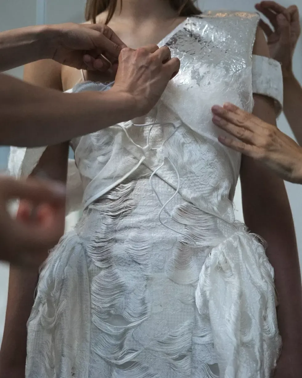 At Copenhagen Fashion Week, Cecilie Bahnsen returns to her home city as a guest designer for the brand’s 10-year anniversary collection, titled ‘Hana-Bi’. Leaning on Bahnsen’s classic archival silhouettes, models emerged onto industrial tarmac in frothy white gowns and sneakers,keeping with the classic codes of the house. The pure white and silver collection featured translucent lace appliqué dresses, sheer organza tie tops, embellished underwear, and quilted babydoll dresses. Long live a Danish diva!