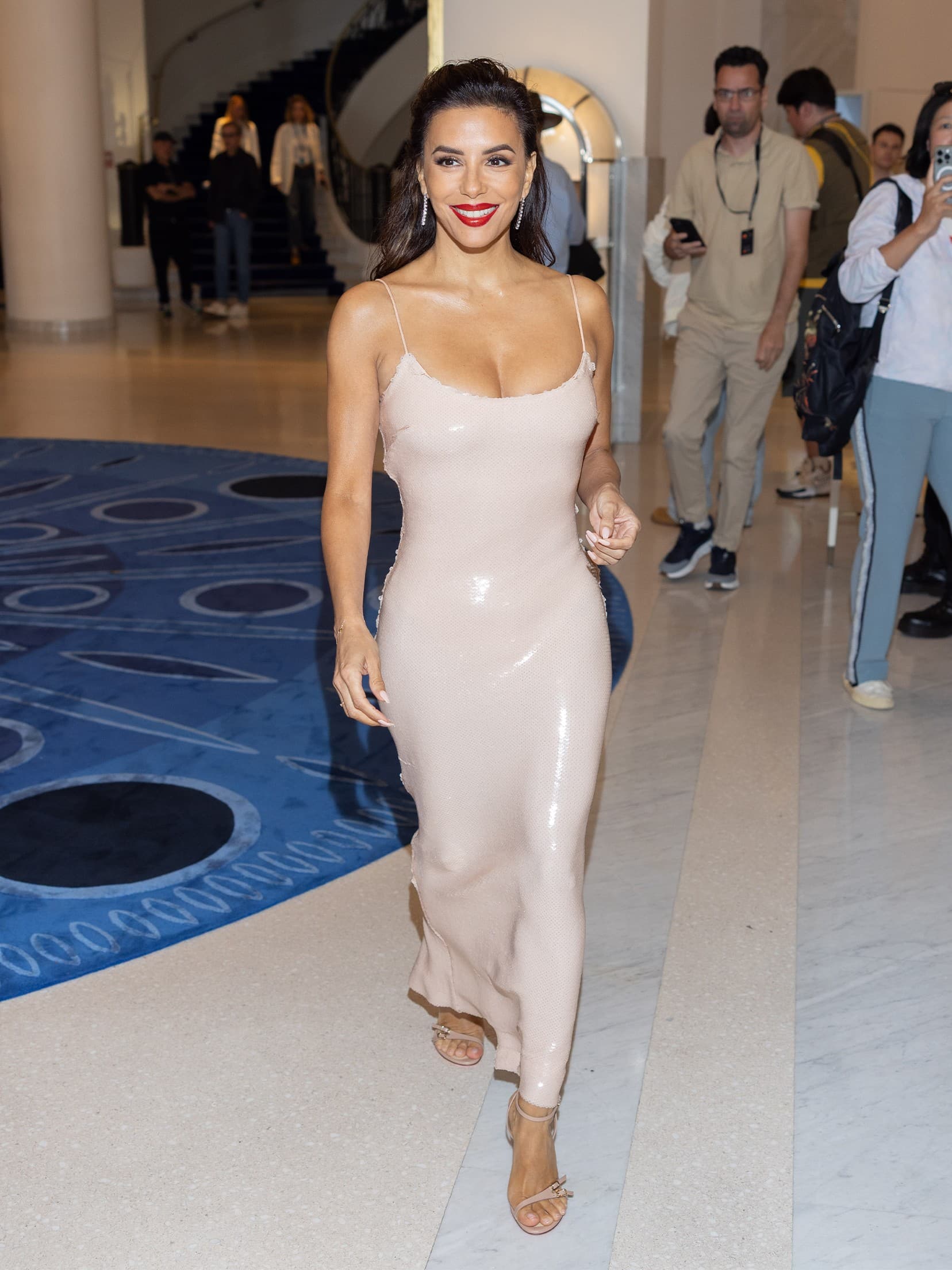 Arnold Jerocki / Getty ImagesEva Longoria arrives in the Hotel Martinez lobby wearing a bespoke, sequin dress in a soft pink, almost beige color.