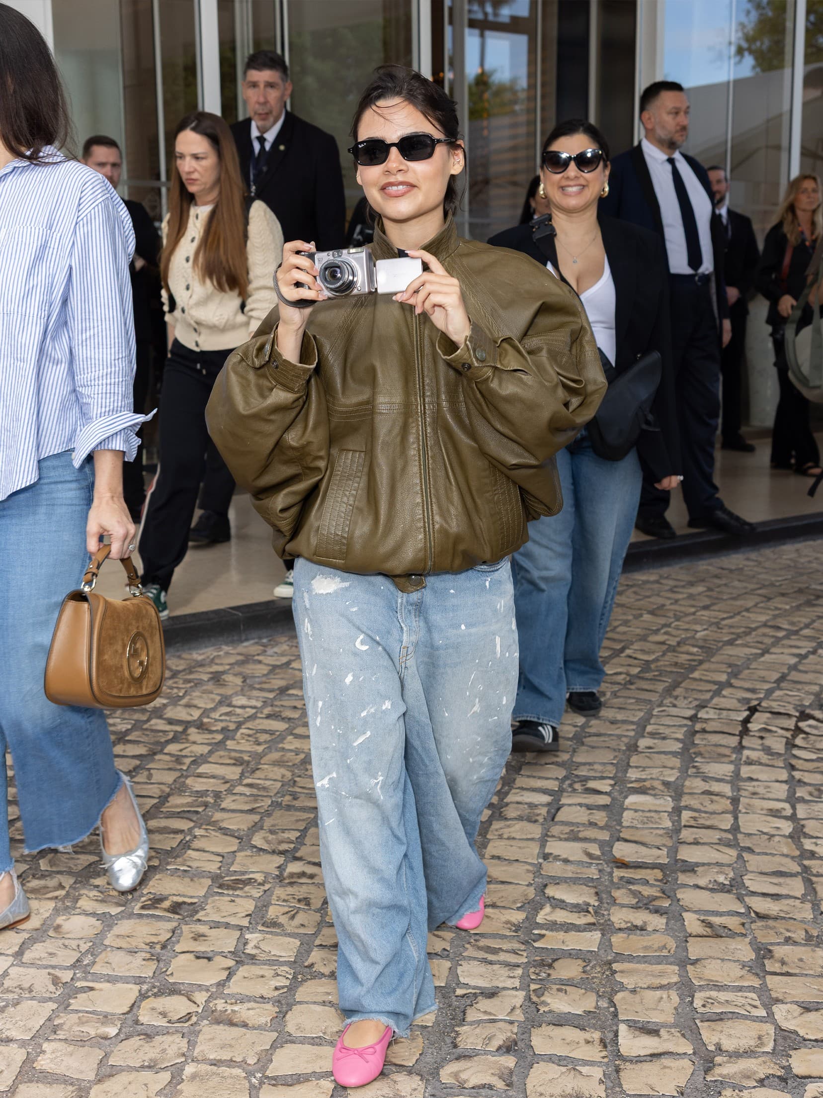 Arnold Jerocki / Getty ImagesActress Ariana Greenblatt wearing a green leather bomber, distressed baggy jeans, RayBan sunglasses and baby pink flats.