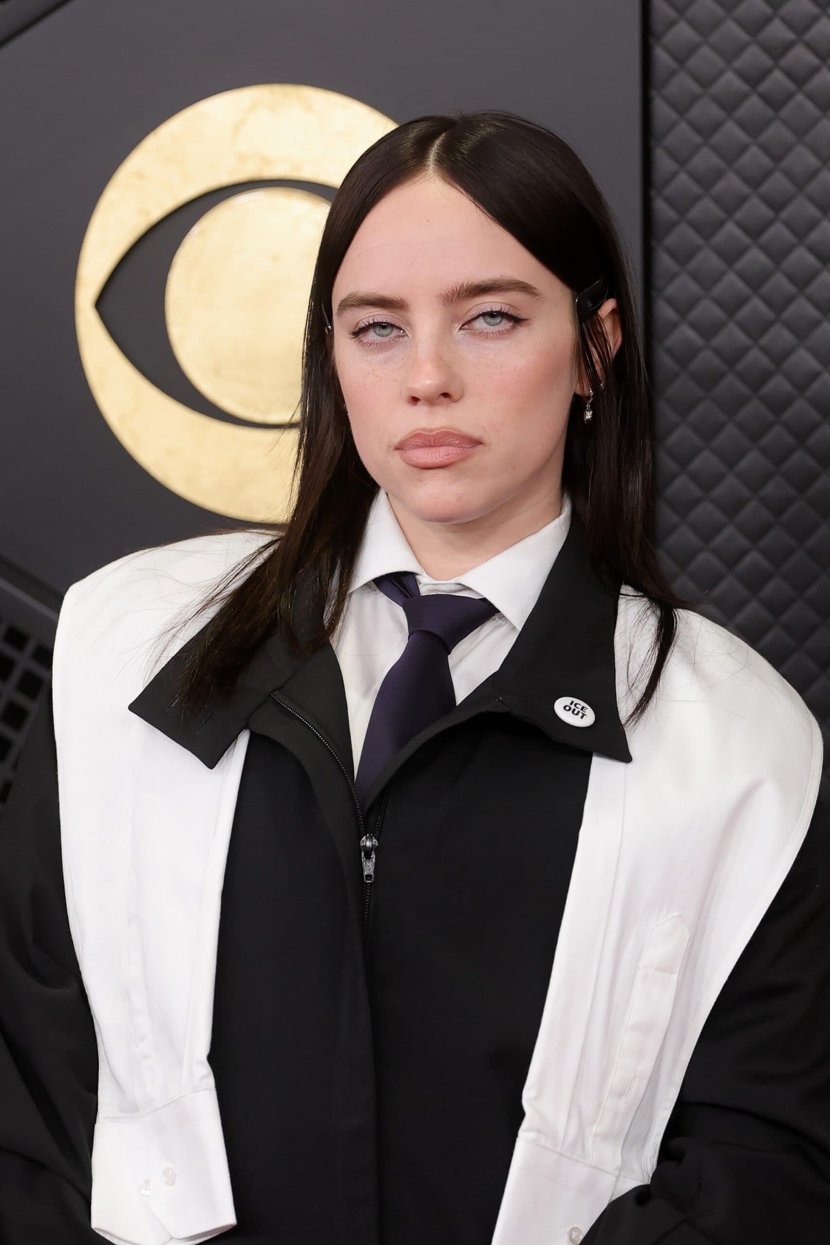 ShutterstockBillie Eilish's custom HodaKova look featured her "ICE OUT" pin on her collar.