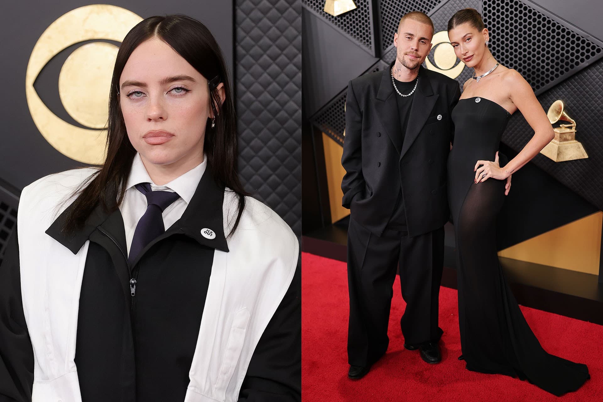 As the nation reckons with the Trump administration's mass deportation campaign and immigration crackdowns, celebrities are showing their support with this subtle detail at the 2026 Grammys. Stars like Hailey and Justin Bieber, Kehlani, and Billie Eilish stepped out tonight wearing "ICE OUT" pins to pledge their stance on what is unfolding in Minneapolis and across America.