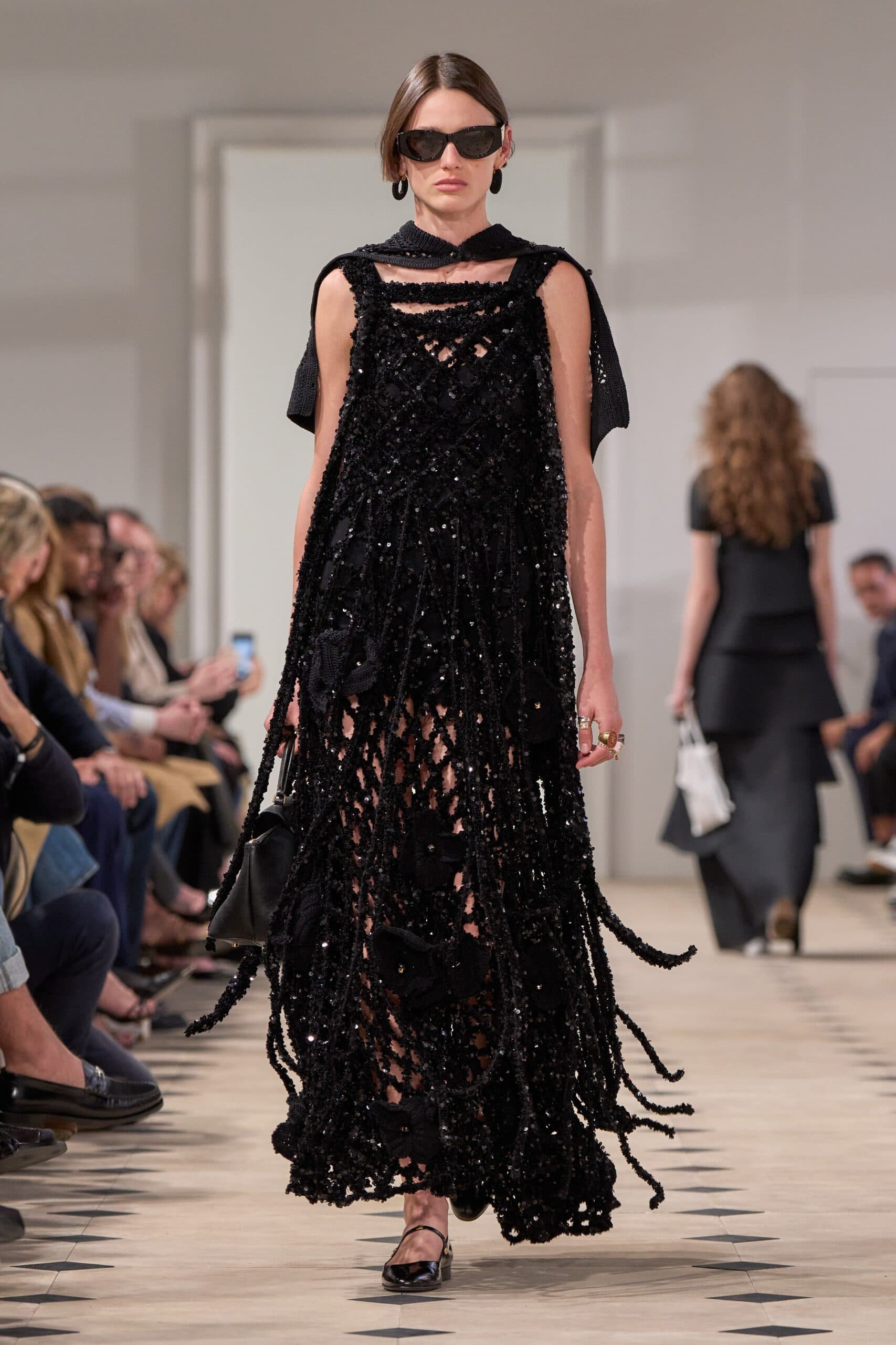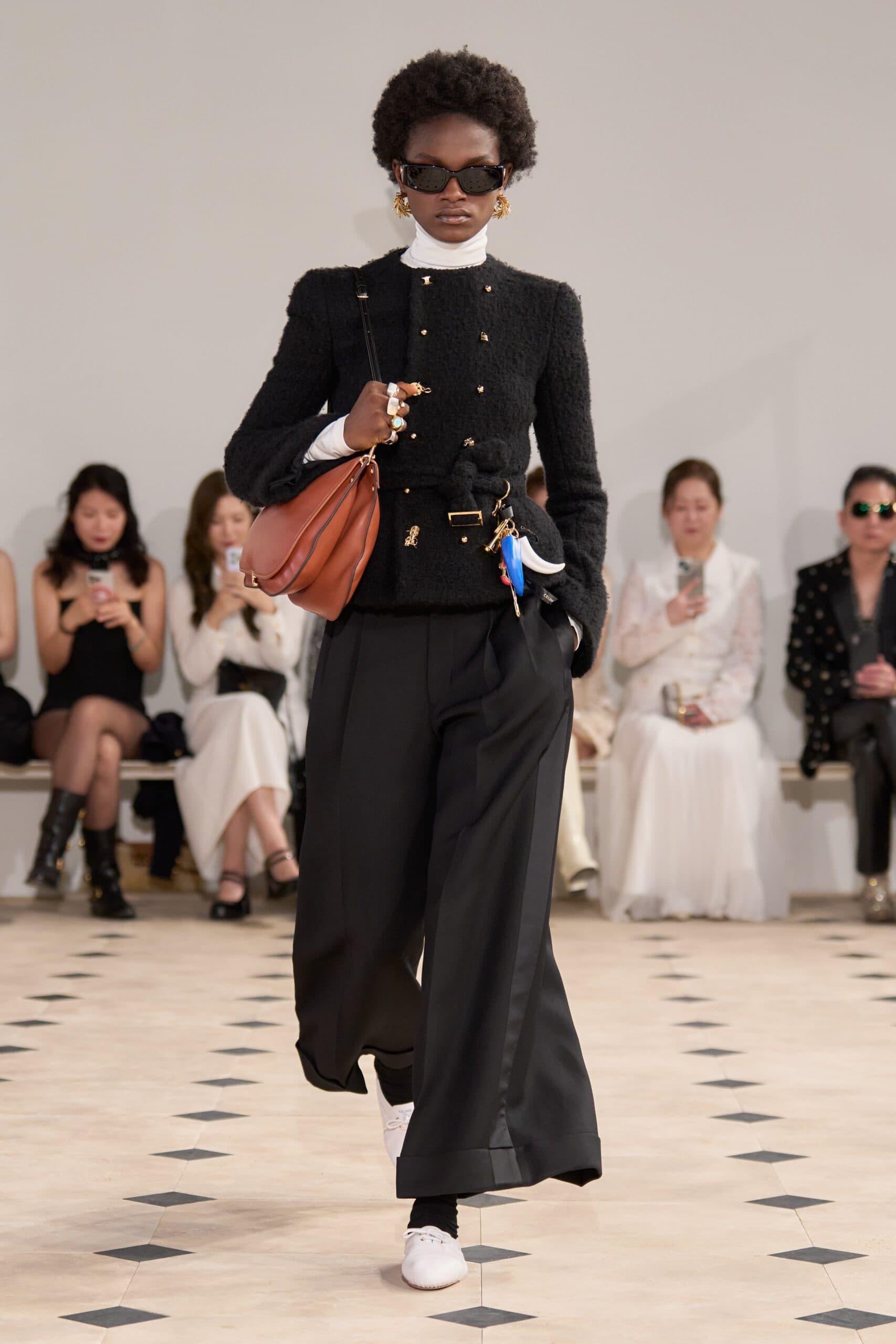 CelineEvening looks were sequined, dark, and subtle. Nothing was overly flashy, save for one beaded woven dress, which was pared back with patent leather mary janes. These lent themselves well to the overall feel of the collection, as did the rest of the footwear, which was decidedly demure with Rider’s take on leather lace-up boxing shoes with the brand motif printed down the tongue, dainty leather plimsoles, simple patent pumps, and classic ankle boots, some with an interesting design cut-out of different patchworked leathers or horsebit details on the toes.