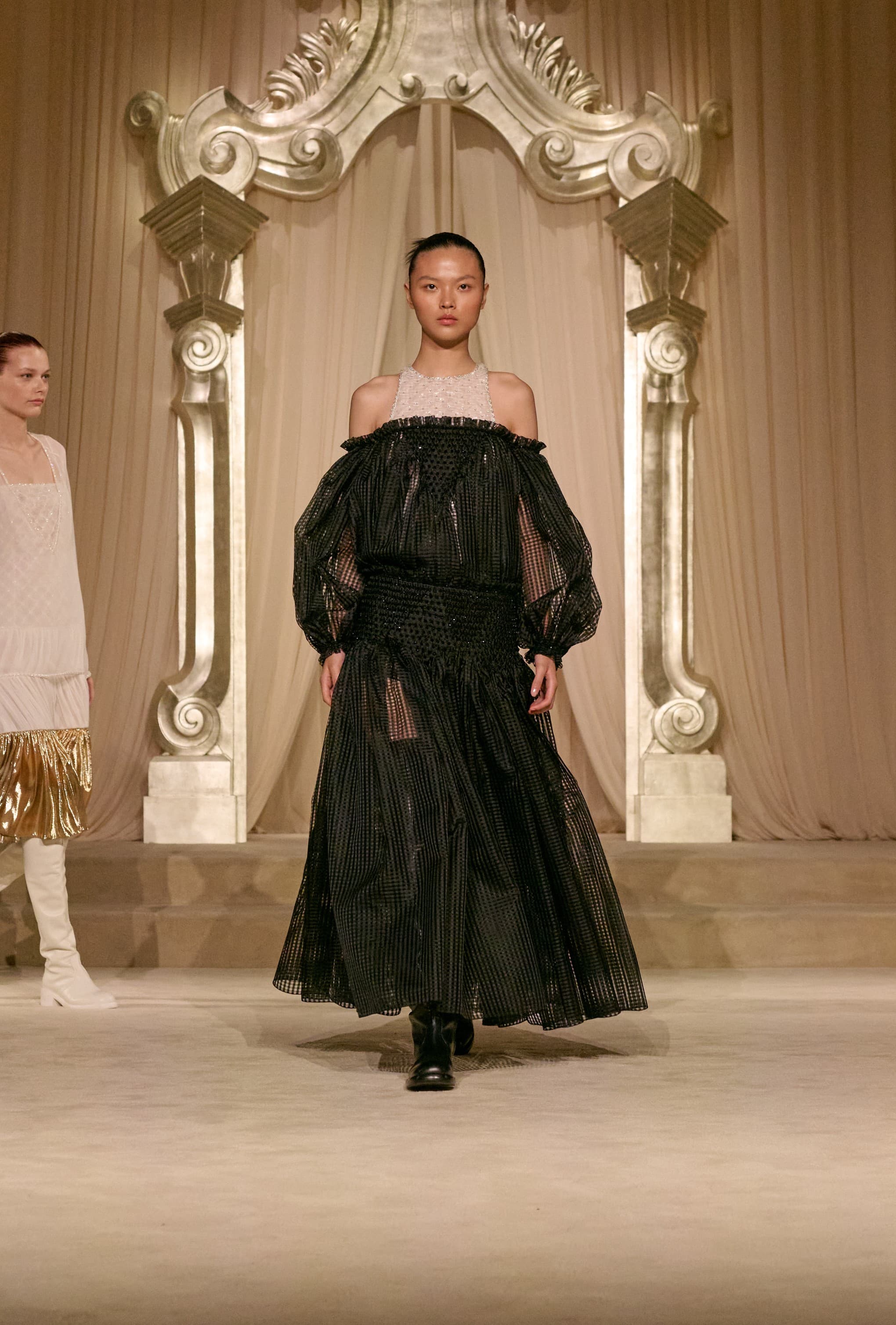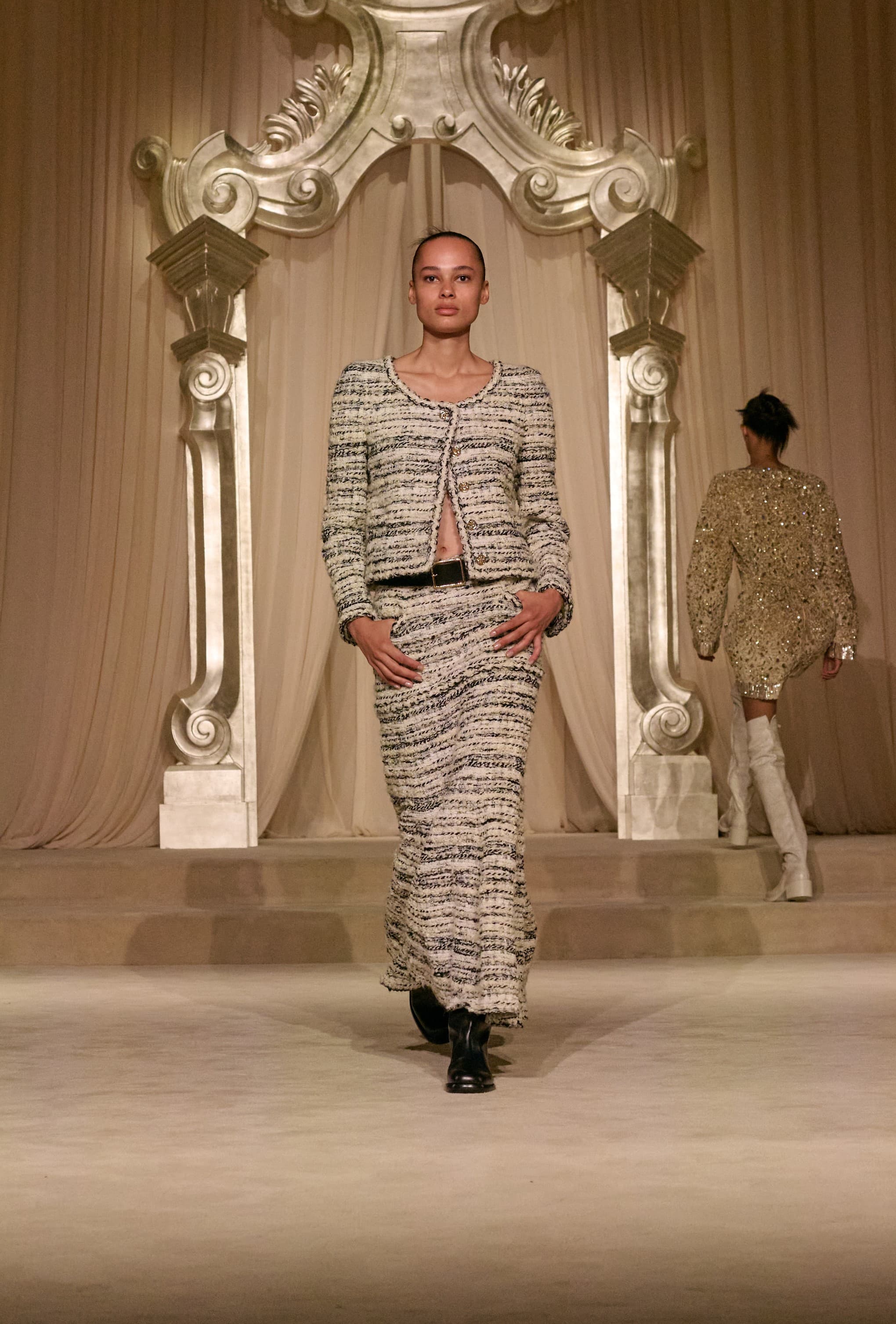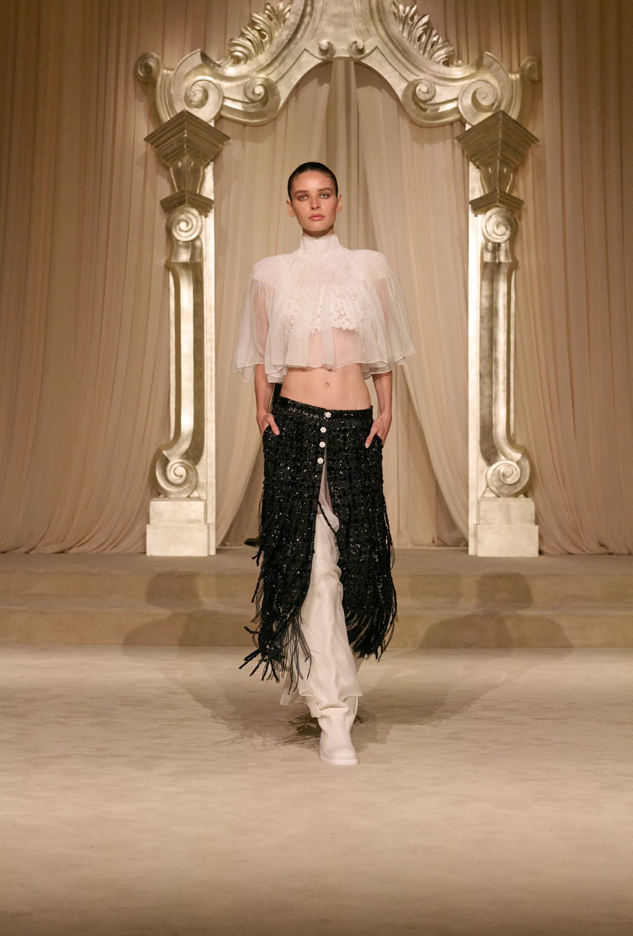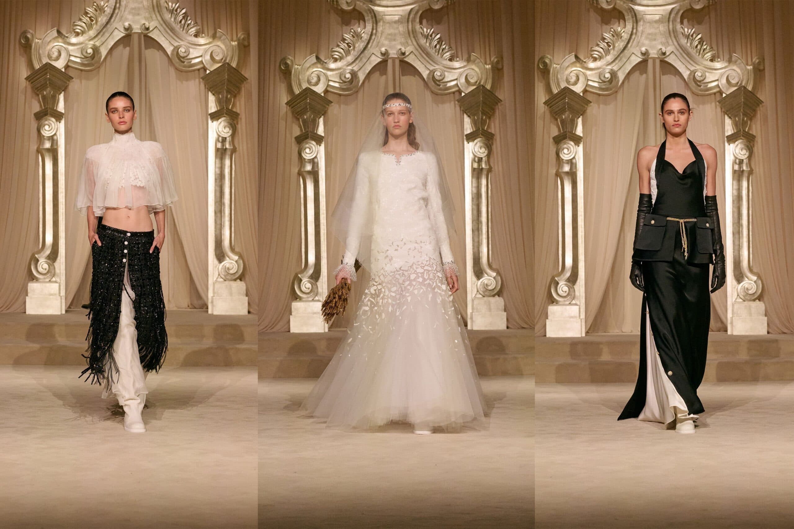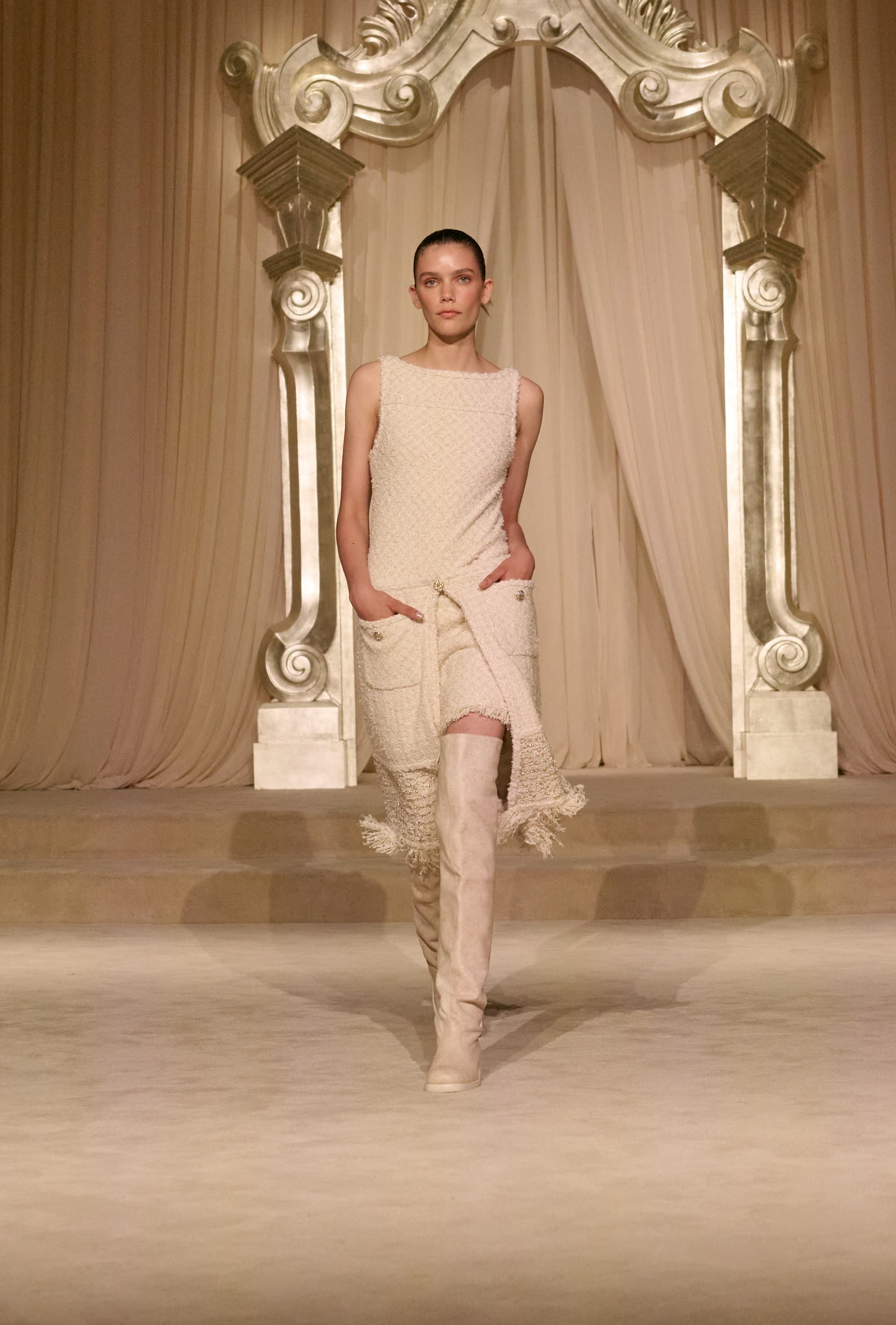 ChanelThe delivery felt powerful regardless. There was a sense of purity throughout the collection, offering a clean slate ahead of Blazy’s debut. Pure whites, ecru, browns, olives, and blacks formed the palette which opened with a procession of tweed, as most Chanel shows usually do. This season, the hems of skirts and jackets featured fringing to give things a slightly bohemian feel. Tweed shorts featured matching belted skirts with pockets layered over the top, which were paired with over-the-knee leather walking boots to give things a boyish edge. There were hunting jackets alluding to Gabrielle Chanel’s love of the Scottish Highlands, which was evident elsewhere in the wheat ear motifs that subtly ran through the collection on buttons, on the guests seats, and in the hands of a bride, who carried a golden bunch as she descended the salon.