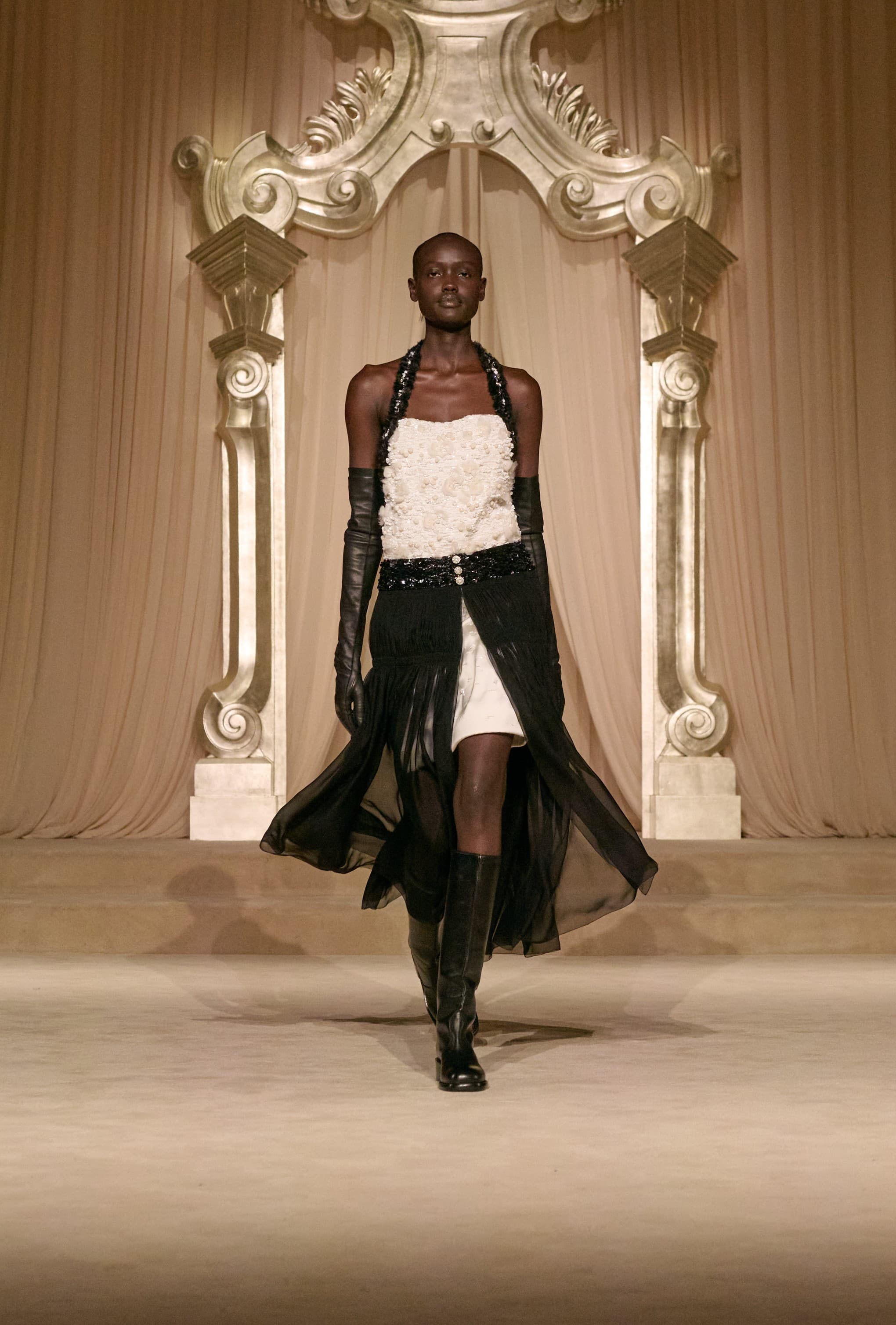 ChanelThe bride this season took cues from '’80s silhouettes. A sequin mermaid tail dress with a simple neckline featured subtly padded shoulders before fanning out into a pile of frothy tulle, scattered with sequin petal motifs. Rewinding back through eveningwear, there were blouses cut from chiffon, tulle maxi-skirts layered with georgette and embellished with ostrich delicate feathers, and under-layers of white lace. Underscoring the delicacy of couture was a coolness afforded through a few looks. It was achieved through low-slung skirts, pocket belts, chunky black belts with simple hardware, and leather opera gloves.