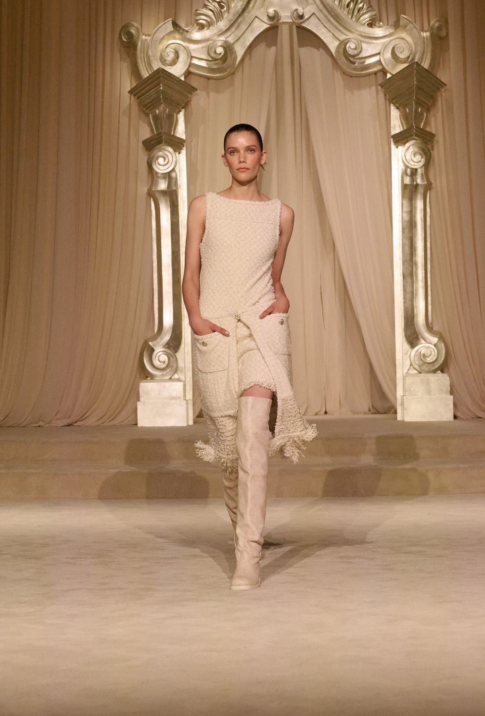 The delivery felt powerful regardless. There was a sense of purity throughout the collection, offering a clean slate ahead of Blazy’s debut. Pure whites, ecru, browns, olives, and blacks formed the palette which opened with a procession of tweed, as most Chanel shows usually do. This season, the hems of skirts and jackets featured fringing to give things a slightly bohemian feel. Tweed shorts featured matching belted skirts with pockets layered over the top, which were paired with over-the-knee leather walking boots to give things a boyish edge. There were hunting jackets alluding to Gabrielle Chanel’s love of the Scottish Highlands, which was evident elsewhere in the wheat ear motifs that subtly ran through the collection on buttons, on the guests seats, and in the hands of a bride, who carried a golden bunch as she descended the salon.
