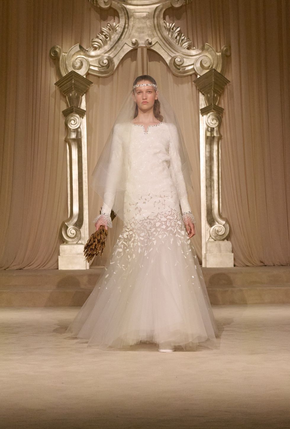 The bride this season took cues from '’80s silhouettes. A sequin mermaid tail dress with a simple neckline featured subtly padded shoulders before fanning out into a pile of frothy tulle, scattered with sequin petal motifs. Rewinding back through eveningwear, there were blouses cut from chiffon, tulle maxi-skirts layered with georgette and embellished with ostrich delicate feathers, and under-layers of white lace. Underscoring the delicacy of couture was a coolness afforded through a few looks. It was achieved through low-slung skirts, pocket belts, chunky black belts with simple hardware, and leather opera gloves.