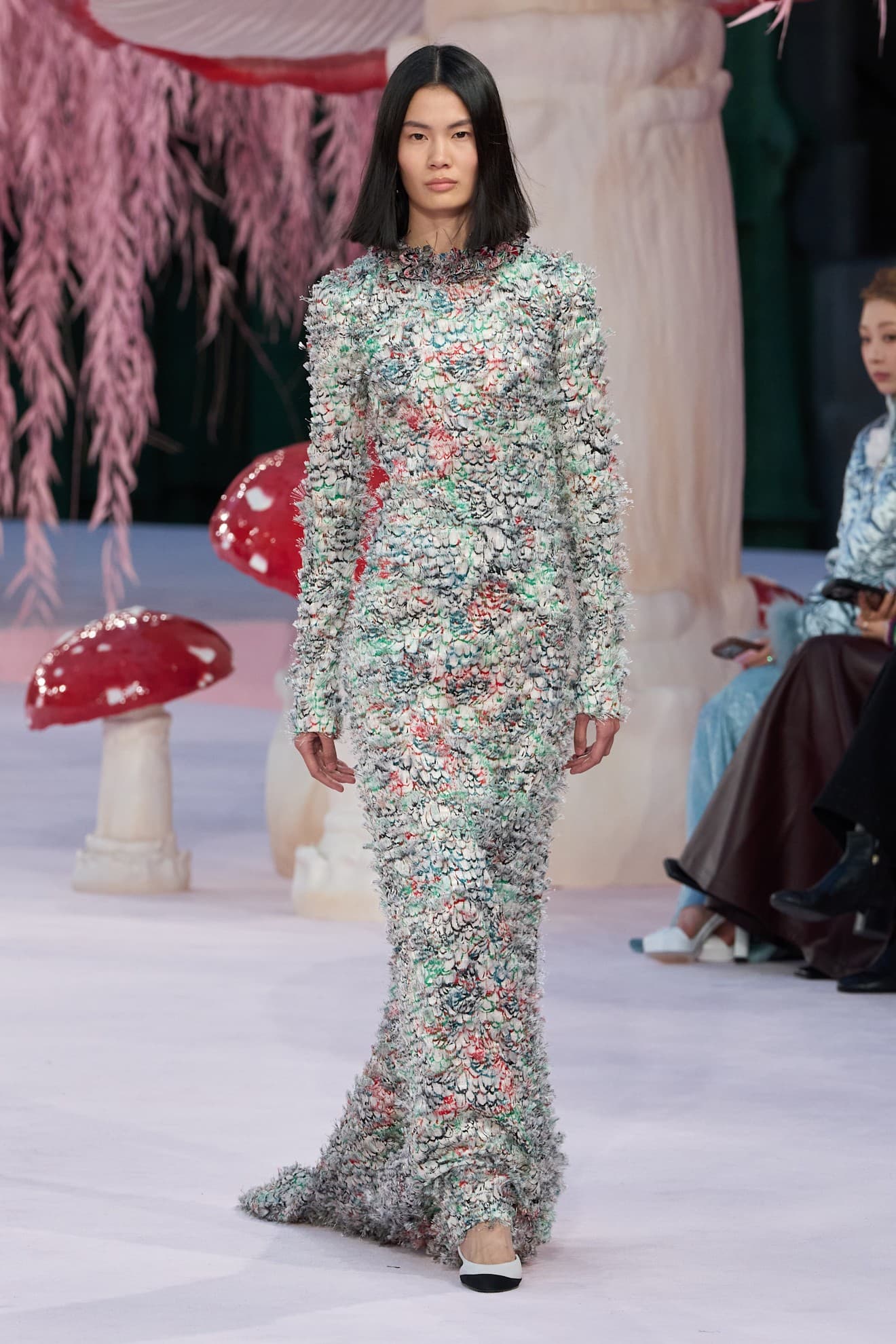 The halls of the Grand Palais are steeped in Chanel’s history. Last September, Matthieu Blazy stepped into this legacy through a set of supersized planets and swirling galaxies, which acted as the backdrop for his debut Spring/Summer 2026 collection for the house. Today, for his first foray into couture, the environment that Blazy settled on was one of whimsical sculpture. Birdsong rang out in the show space, which was carpeted in baby pink, surrounded by a circle of powdery pink willow trees and dotted with gigantic mushrooms in orange, mauve, red and white. It was a setting that conjured a sense of innocence. While nature was at the forefront of Matthieu Blazy’s vision, the true centerpiece of Blazy’s couture was body, soul, and the Chanel woman.
