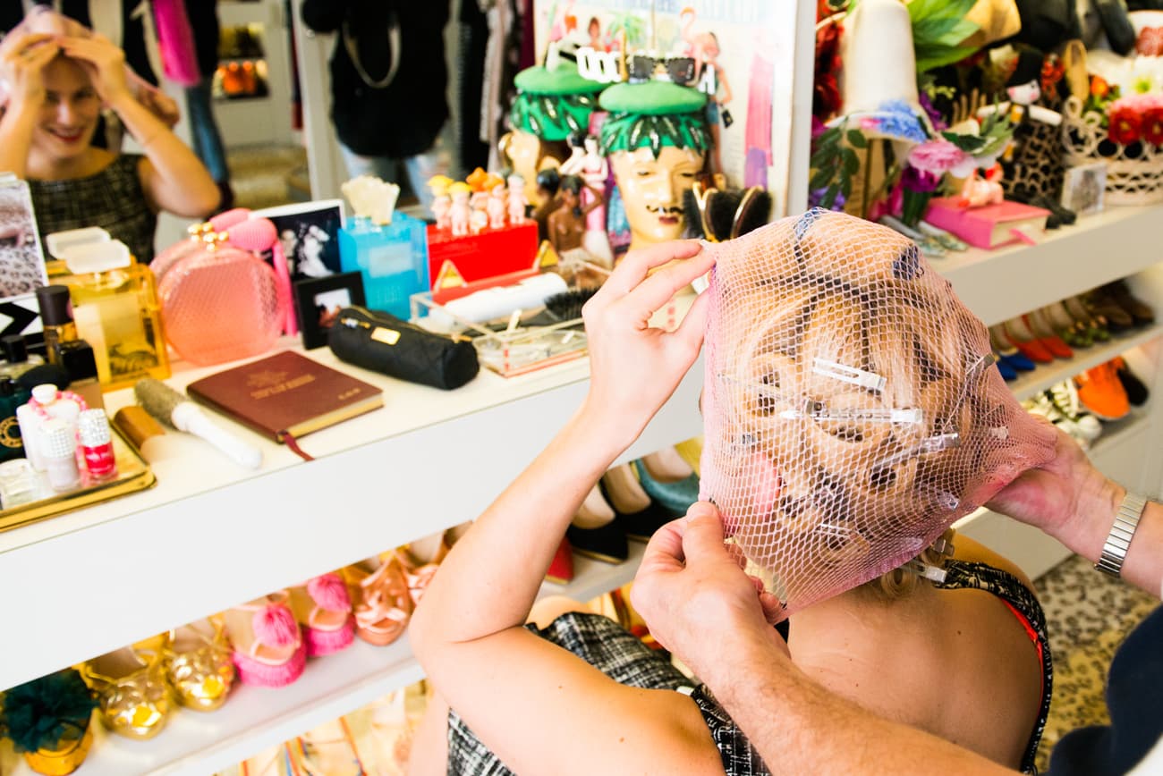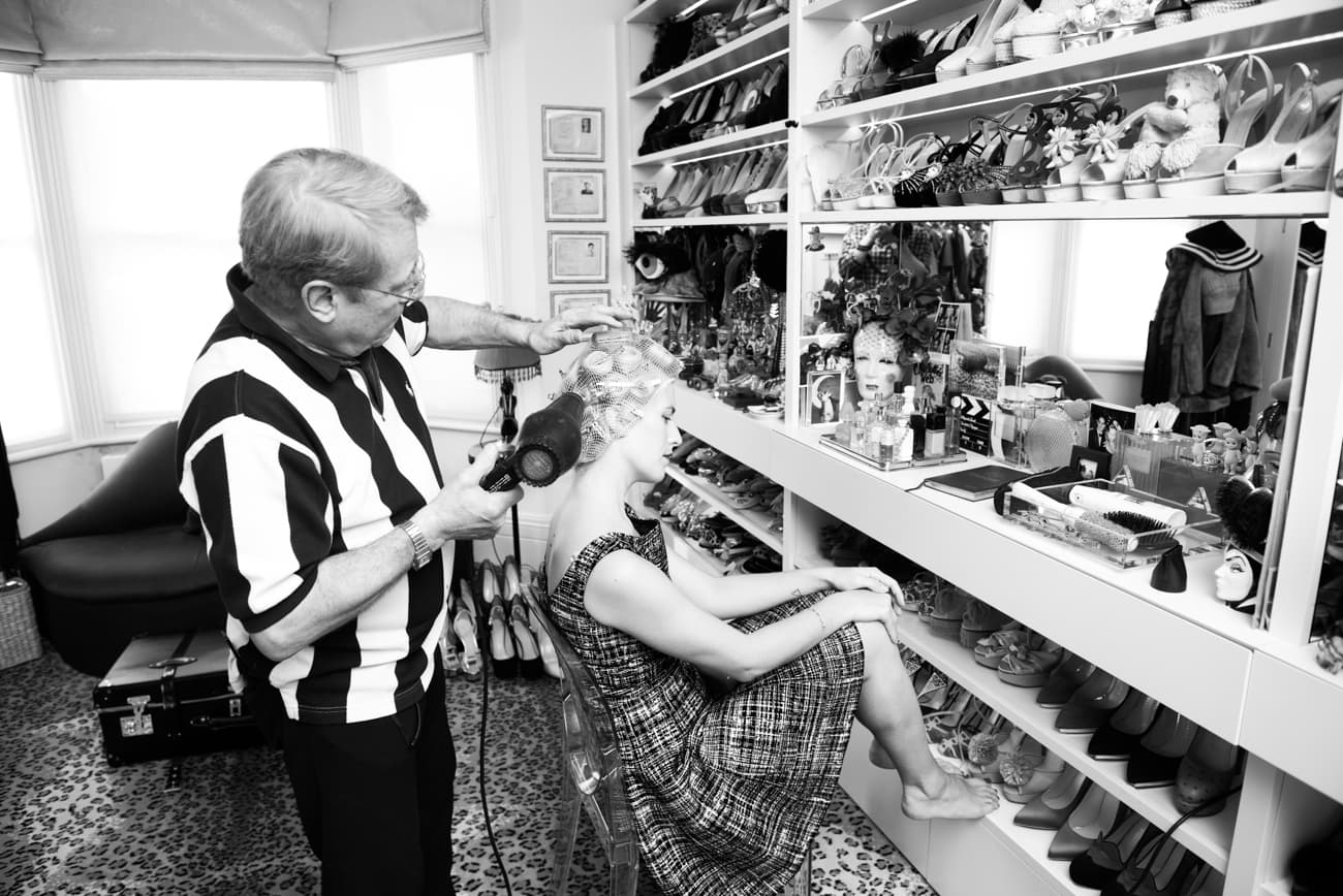 "I say this look looks high maintenance, but it’s not. It takes about an hour to do and I do it the old-fashioned way—so setting lotion, pin curls, under dryer with a little pink hairnet, back-combed and then sculpted into shape with lots of hair clips and let it set for a bit. So, it doesn’t take too long, but it lasts forever—it’s a bit like a helmet, so to speak. I wake up and it’s still the same and then just a bit of red lipstick. So, it looks high maintenance, but it’s actually quite low maintenance. I like to say I wake up like this, ha! No I don’t. Yeah, so it’s part of my look, I don’t do it any other way unless it’s summer and by the beach and I just have it straight back. It’s all thanks to my best friend John, the other man in my life."