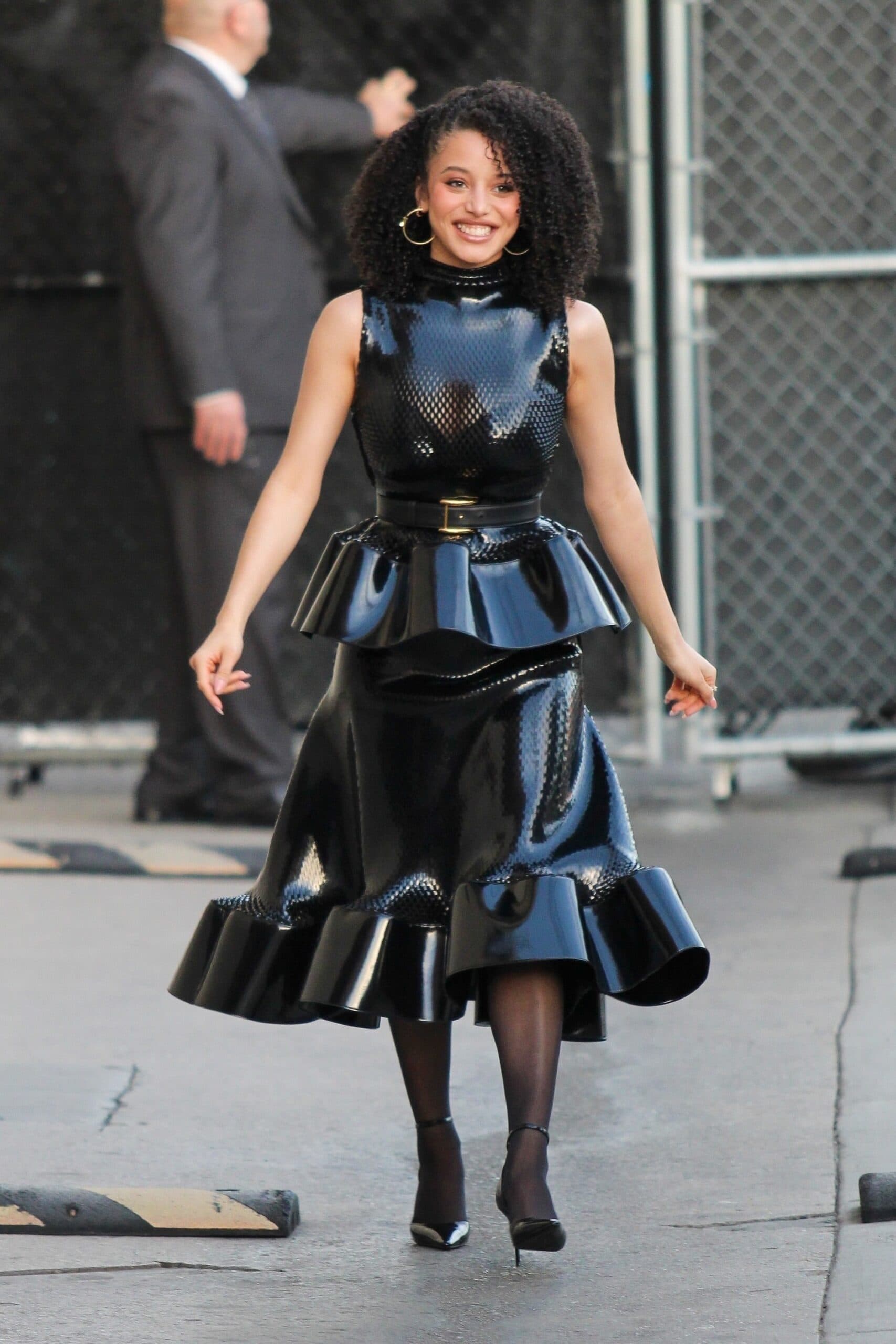 Melanie Miller / BACKGRIDFor her Jimmy Kimmel, Chase Infiniti pulled a look from Alaïa's Resort 2026 collection: a belted peplum top and matching skirt, both in a shiny PVC material.