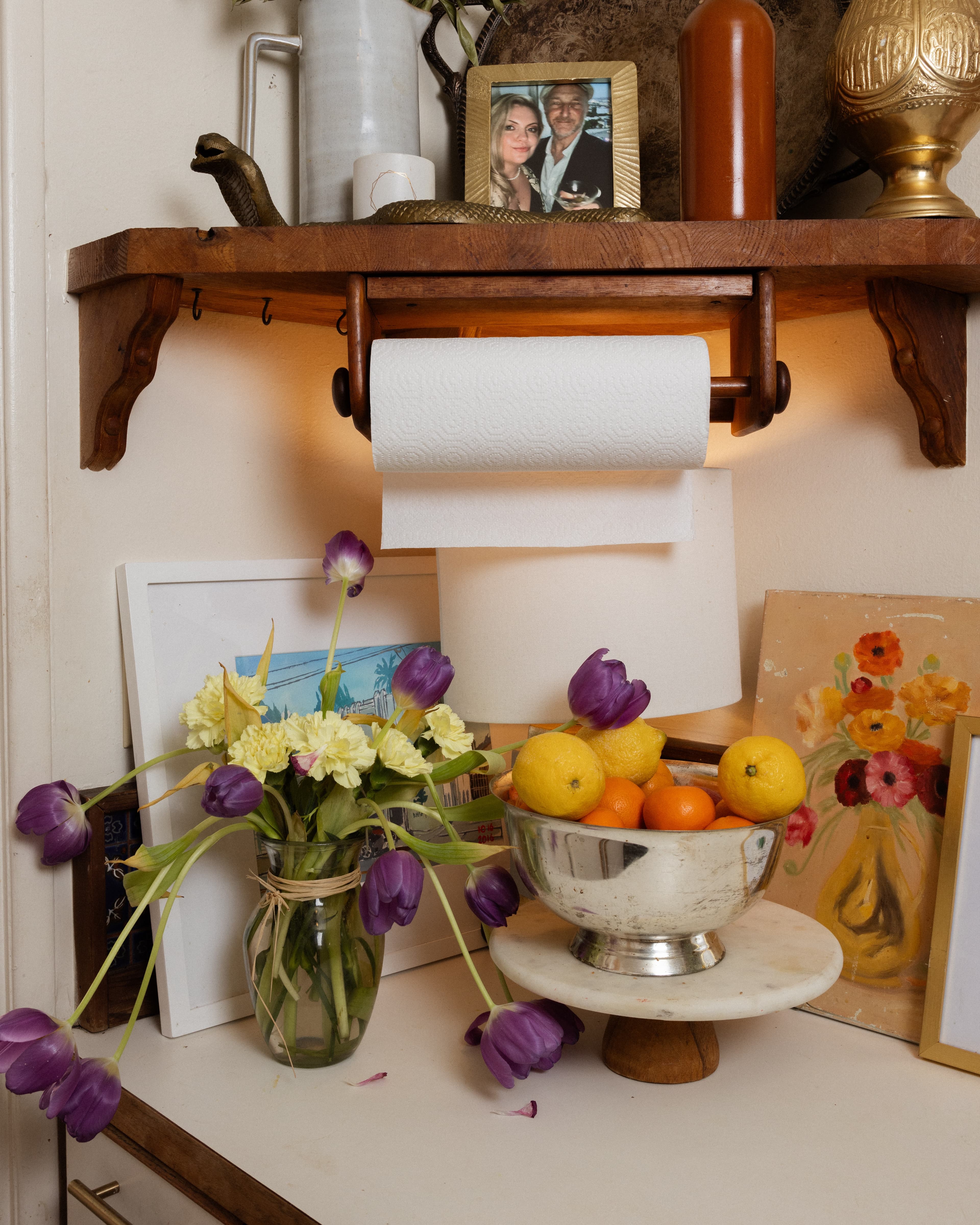 On Anne, Vest: Magpies and Peacocks; Mules: Yume Hume; Ring: Paume Los AngelesAbove a kitchen window, I see a photograph of Julia Child on the set of her cooking show The French Chef. Following my eyes, she says, “One of my friends had that made up for me because I also had to have my counters raised on my show. I’m too tall.” We wax poetic about Child—her work in the U.S. Secret Intelligence division in WWII and how she discovered a passion for cooking in her 30s. Martha Stewart used to work in finance, and Thornton herself worked at Apple. We agree that Stewart is both a genius and “super hot.”