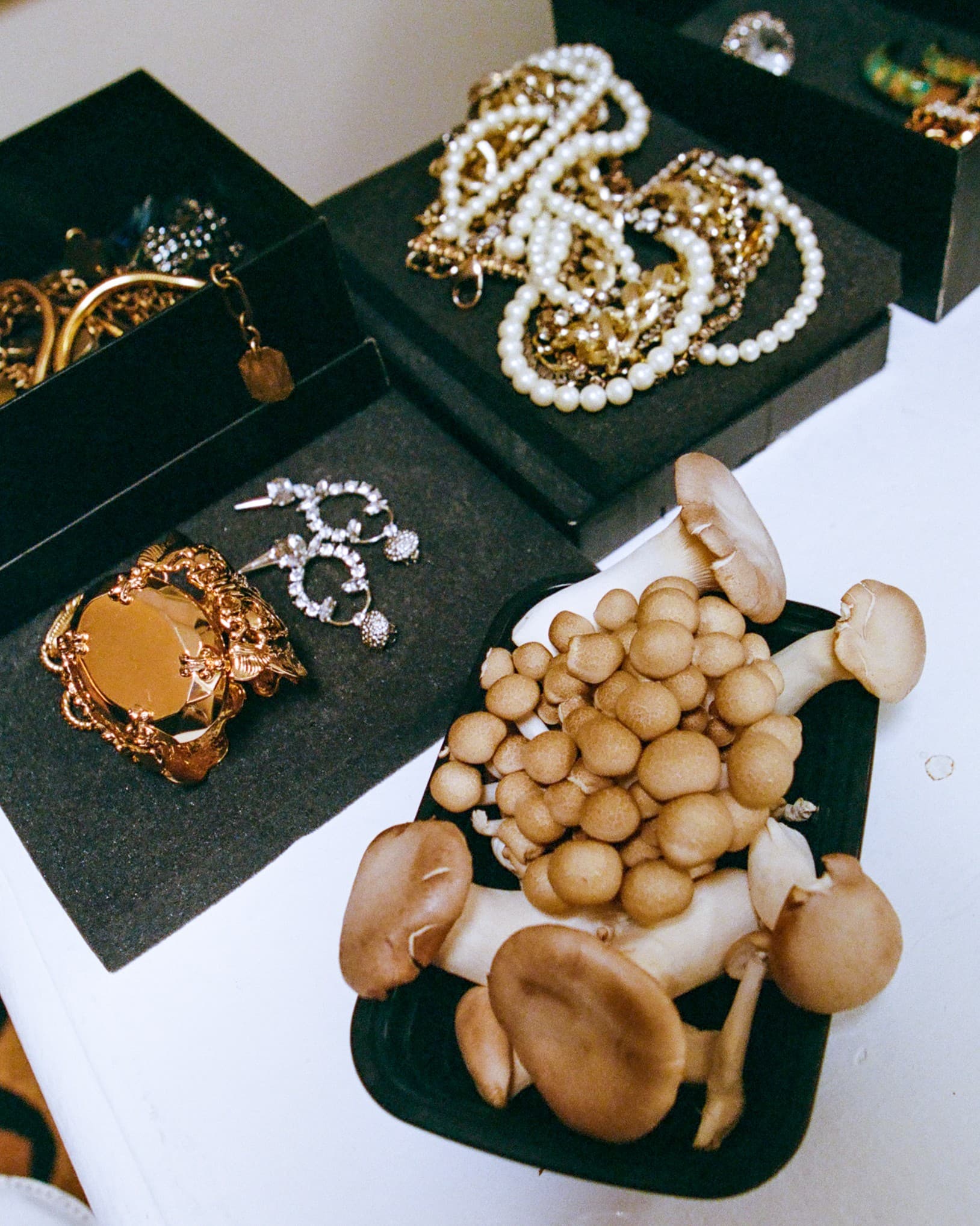 After getting the escargot in the oven, Thornton begins cutting the stems of oyster mushrooms into medallions to go alongside the enokis on top of her porcini and truffle ravioli. She tells me, “It’s all plant-based because, especially with psilocybin, when people do journeys with ayahuasca, they are told to go on a two-week protocol, and there is no meat involved. No meat, no sugar, no caffeine, all of it.” I ask, “Is it because with ayahuasca, you throw up and poop your pants?” “Exactly,” she answers. “Anytime you’re dealing with any kind of mind-bending thing, it’s good to be in a high frequency, energetically. Plants are the highest frequency, and mushrooms are one of the oldest living entities on the planet.” She holds up the mycelium, the root network at the base of her enokis, and tells me she will save it for vegetable stock. She adds, “I read that if a tree gets chopped down, the mycelium in the forest tries to resuscitate it if its root system is still there. That’s why you see shoot-offs of mushrooms on a stump. They are trying to give it CPR.” Like a true Gemini, Thornton spouts off scientific fun facts with the same excitement as a bit of hot gossip, “When it comes to mycelium, there are so many options in terms of sustainable farming, fake meat, even mushroom leather. It’s a prehistoric intelligence that has existed since the beginning of time. It’s the first known thing on this planet. We’re doing a plant-based dinner, but we’re also connecting to that greater mushroom energy.” Whenever she approaches a topic on the “woo-woo” end of the spectrum, she reflexively crosses her eyes as if to put a knowing set of air quotes around the statement while her hands are full.