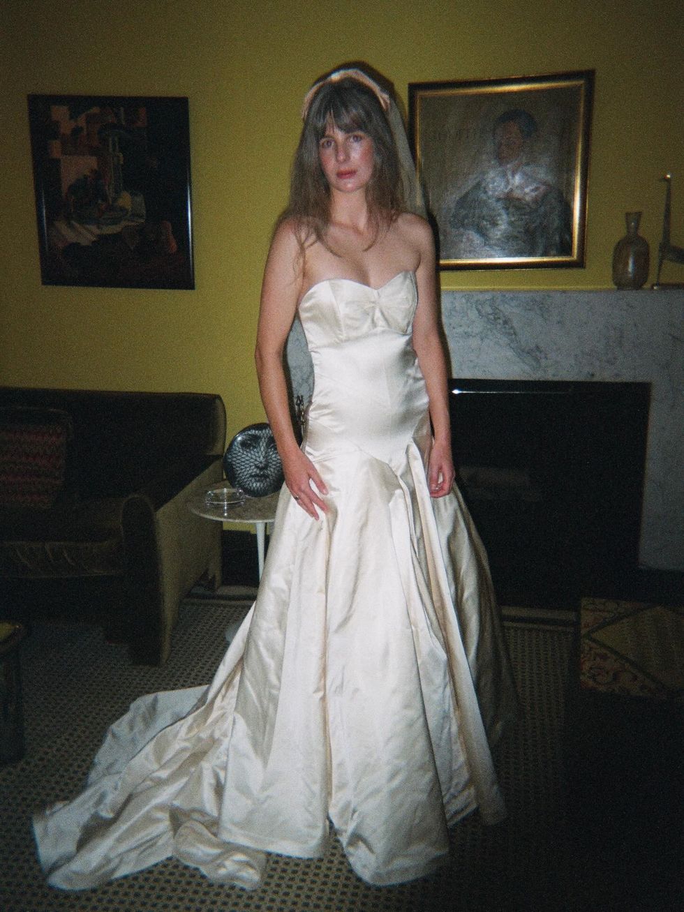 Luckily, we had found vintage bridal shower, bachelorette party, and after-party looks, and we still had a few unexplored leads. On one of the first Spring days of the year, in an idealistic brownstone in Clinton Hill, Brooklyn that we all spoke about dreaming of owning, Ellie invited her closest friends for a staged wedding photoshoot she was cast for and sold us on the idea by emphasizing that there would be complimentary food and drinks. Even her fake wedding was all-vintage or secondhand. We were all styled by Studio Dorothy, a New York-based vintage bridal-sourcing business founded by Lizzie Wheeler. In this instance, the lead found us.