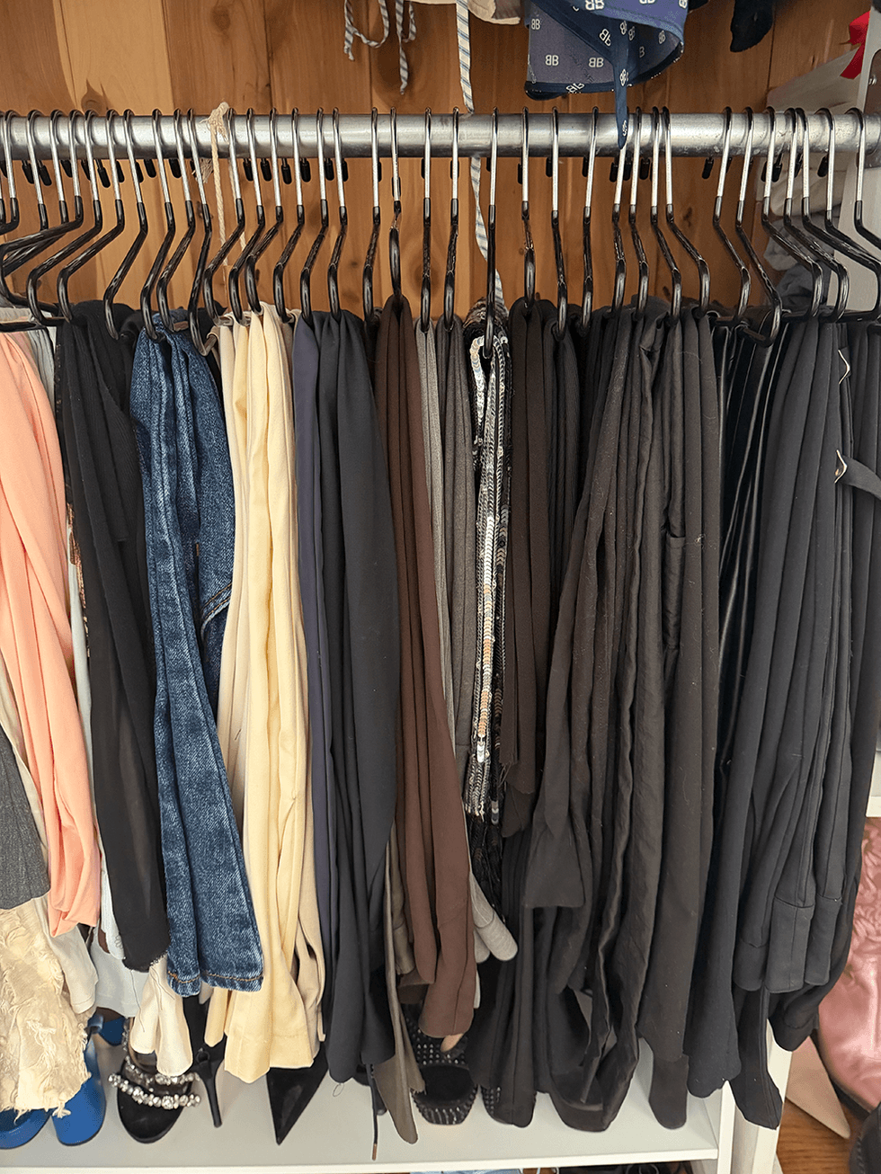 Shoes and bottoms are two particular things I have in excess. I was concerned there wouldn’t be enough room for them, but Bazail proved me wrong with a few key tricks. For shoes, Bazail is a firm believer in going vertical. "Shoe stackers are great because they instantly double your storage without taking up more room," she explained, as we transformed what had been a ground-level shoe pile into a tidy, stacked display. For pants, instead of clipping them or folding, she flipped them over these non-slip hangers. Not only does it look satisfyingly organized, but it also gives you full visibility of every bottom you own.