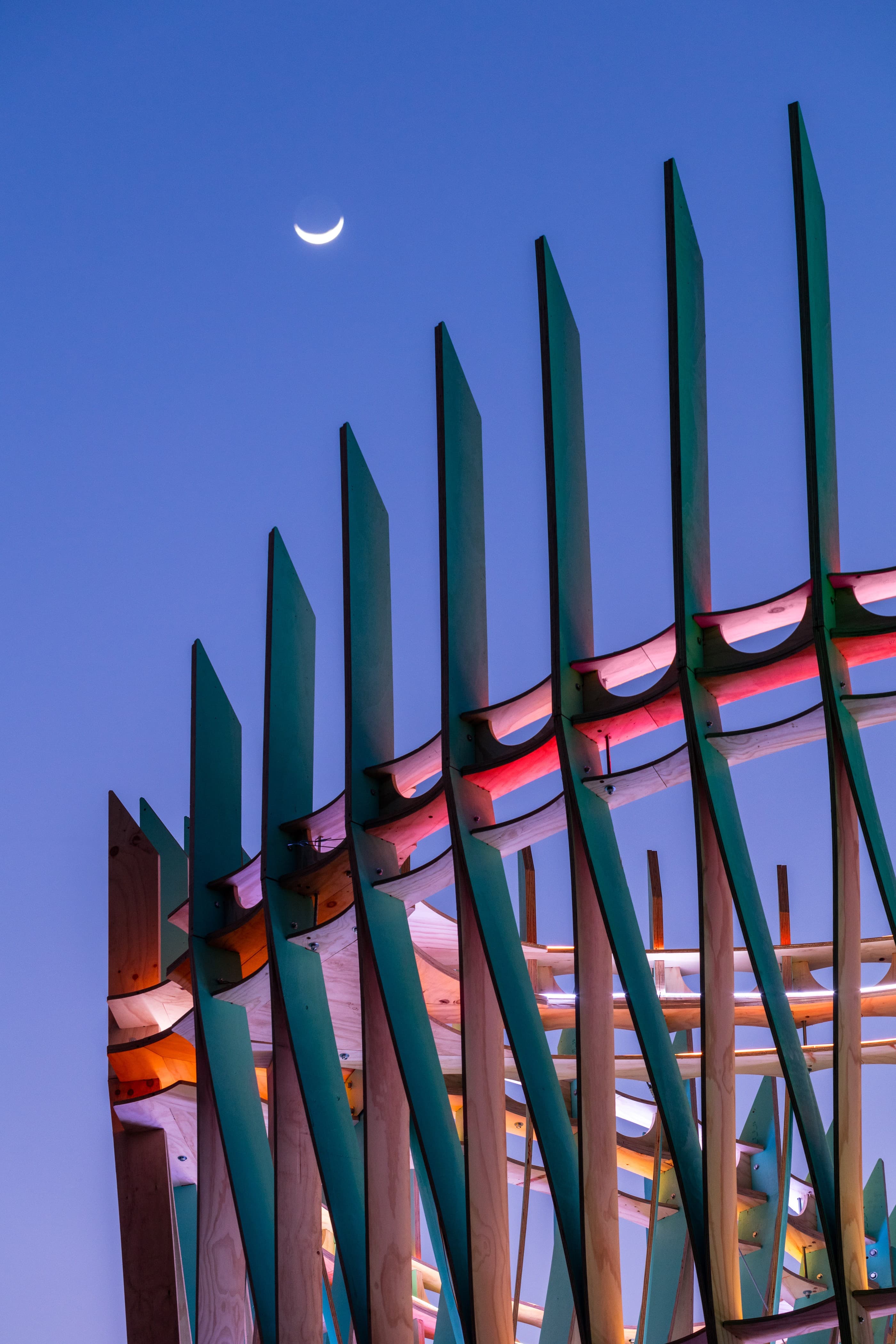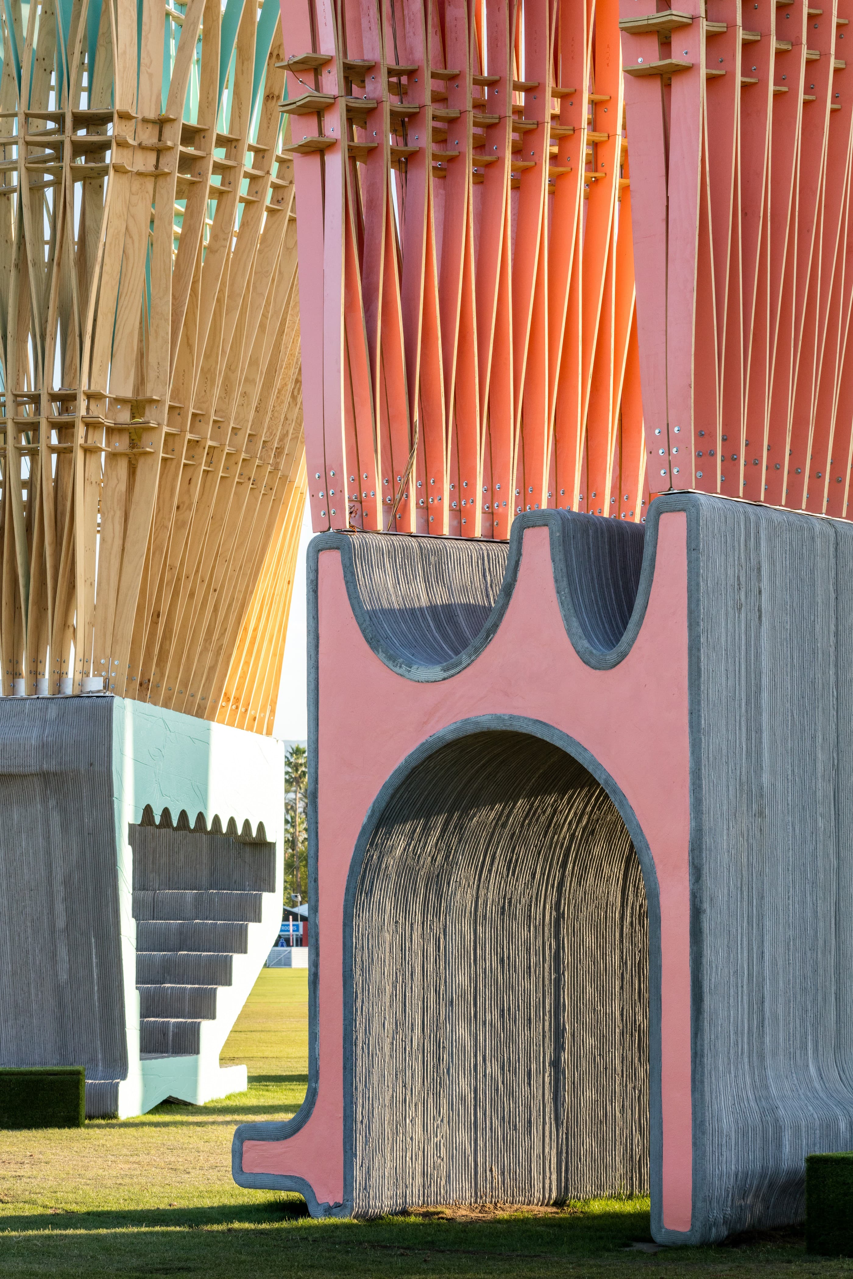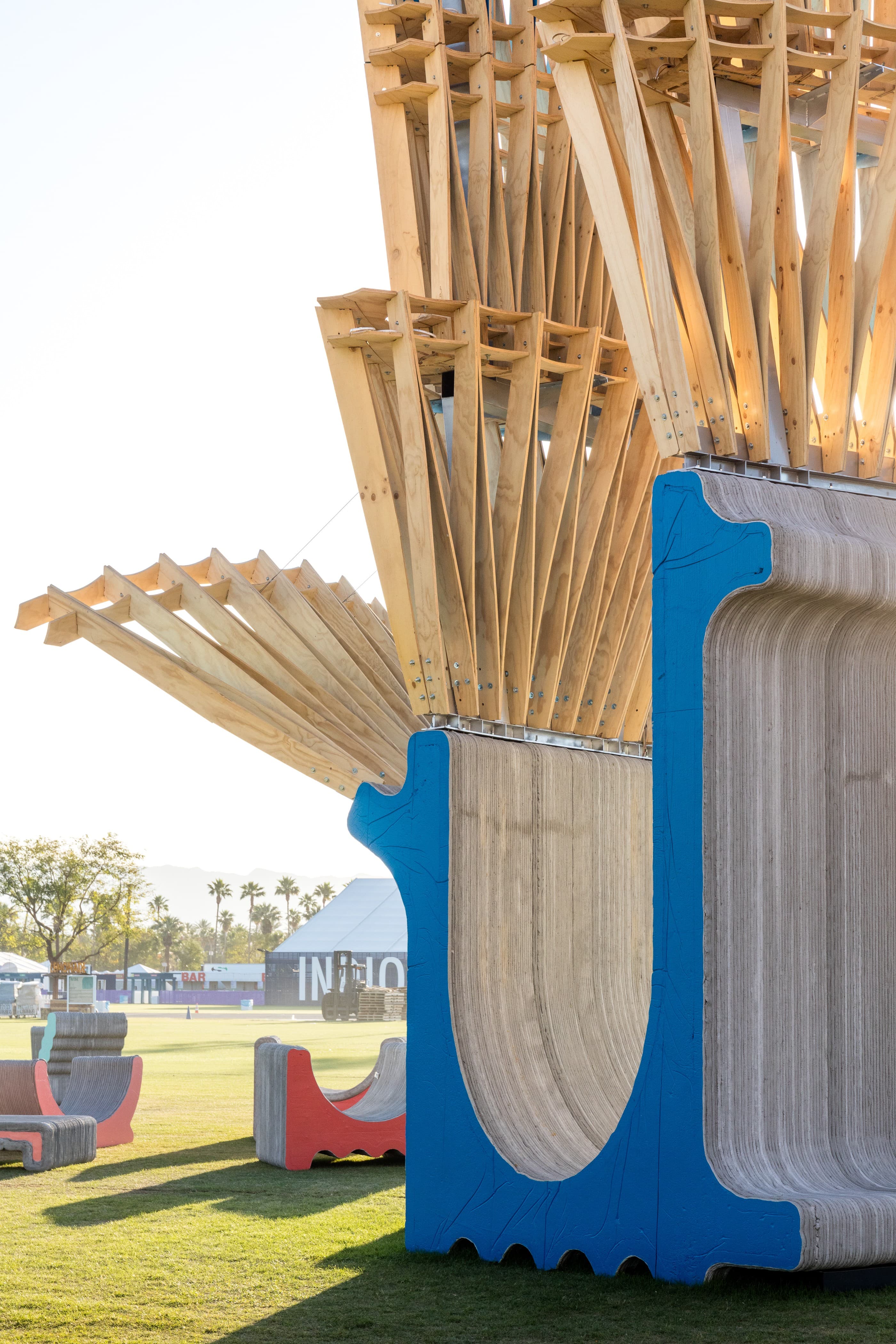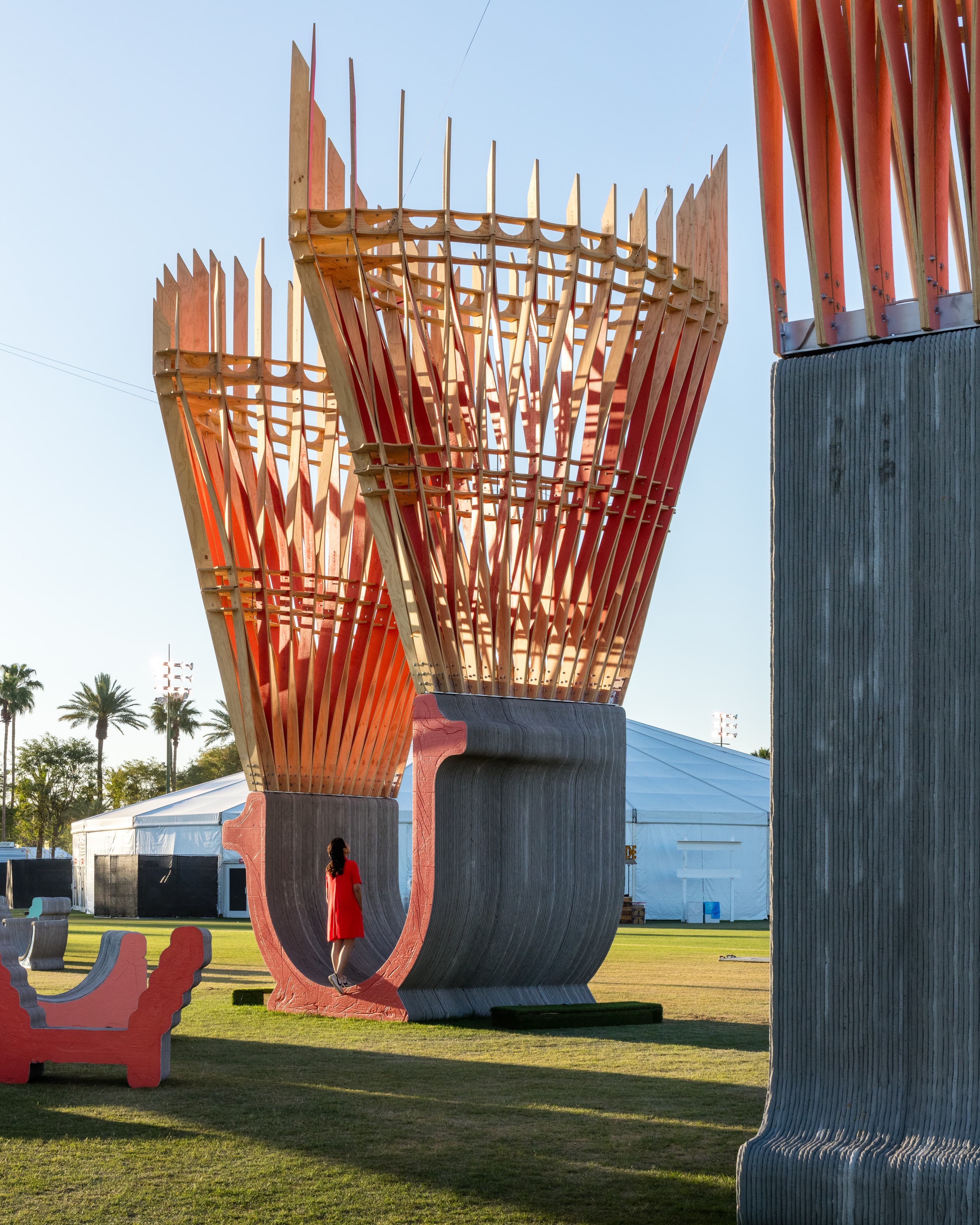 James FlorioWhen it was time to relax, I sat in the cradle of oversized, 3D-printed concrete armchairs that were part of HANNAH’s Monarchs: A House in Six Parts. This was the most peaceful place I could find on the festival grounds. I stared up into the towering, parametric structures, which reminded me of the feathers on a shuttlecock, as sounds from the festival blurred together. In the daytime, when the speakers were still set to a reasonable volume, I couldn’t make out the lyrics from Sabrina Carpenter on the Coachella Stage or hear much more than the spooky beat pulsing from Eartheater in the adjacent Sonora tent. As the sun went down, LED rings lit up Monarch’s plywood blades, and it glowed in cyberpunk shades of orange, pink, and purple.