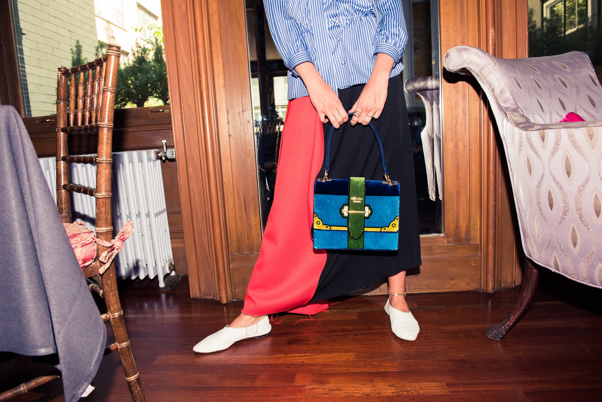 “I definitely love a smaller bag, especially when I’m running around and I don’t know if I get to change a bag to wear out at night. I love the large Prada Cahier bag for day, but I think the small ones are great to go from day to night. And I love that trompe l’oeil design. I just did a piece for my site on these trompe l’oeil dresses, and through some research I found in the early 1930s, Schiaparelli launched her line with trompe l’oeil knit sweaters, so I’ve kind of been obsessed.”