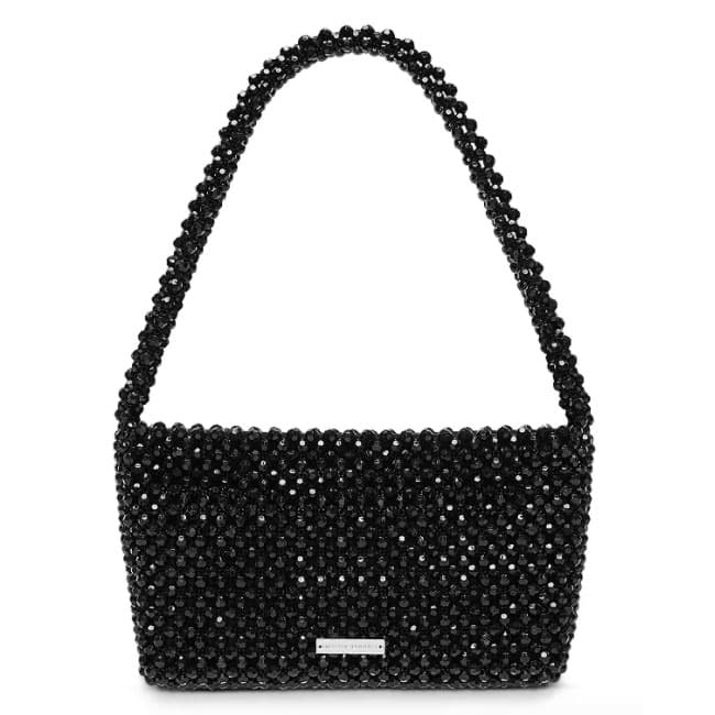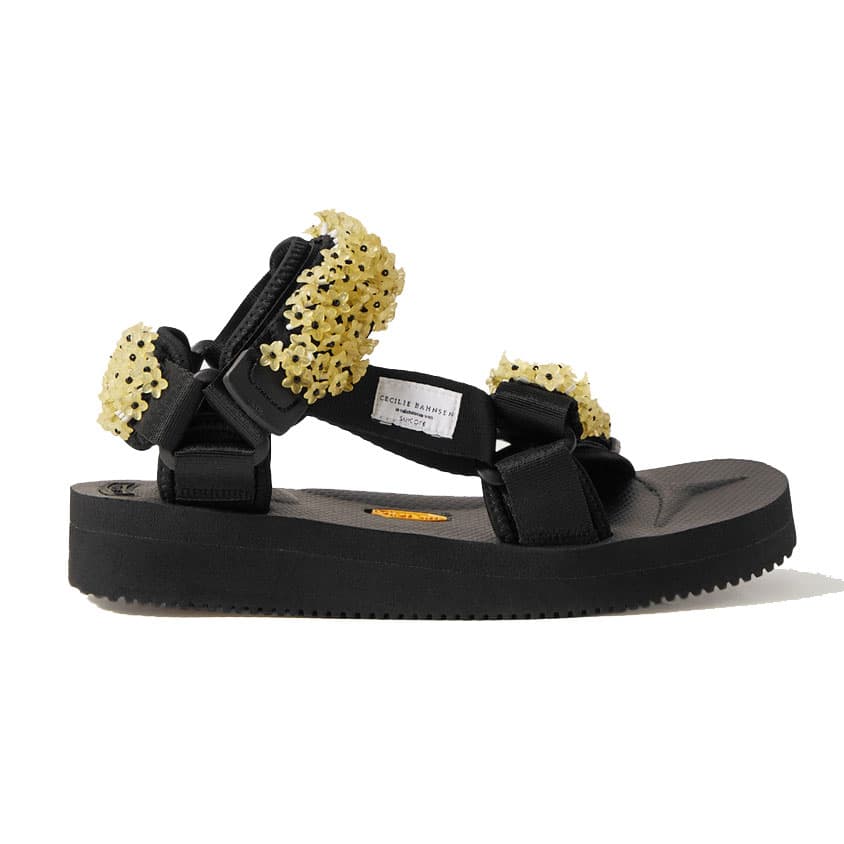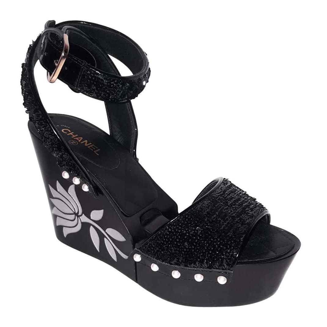 Wedge Black Sandals w/ Faux Mother of Pearl Flower & Sequin Straps