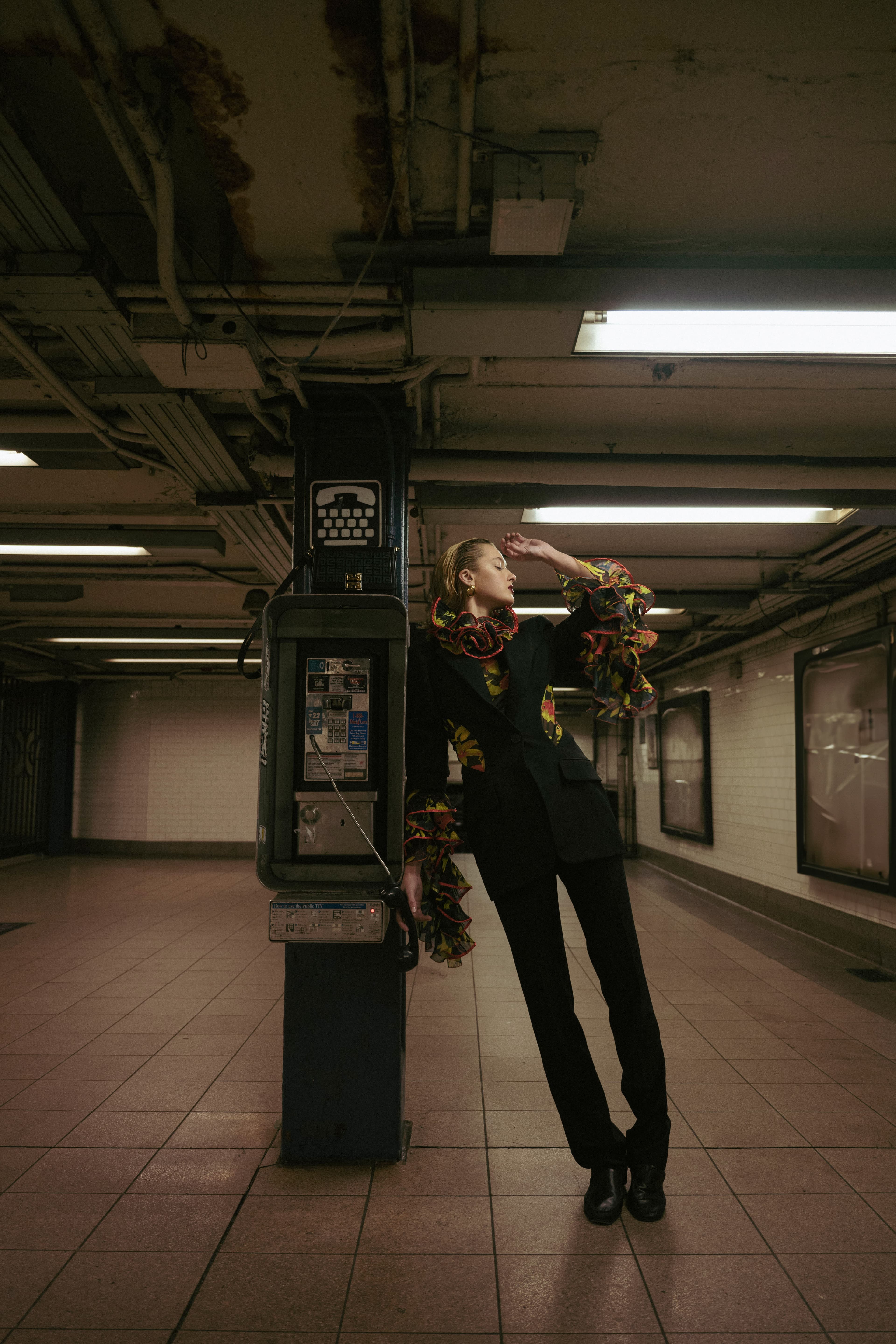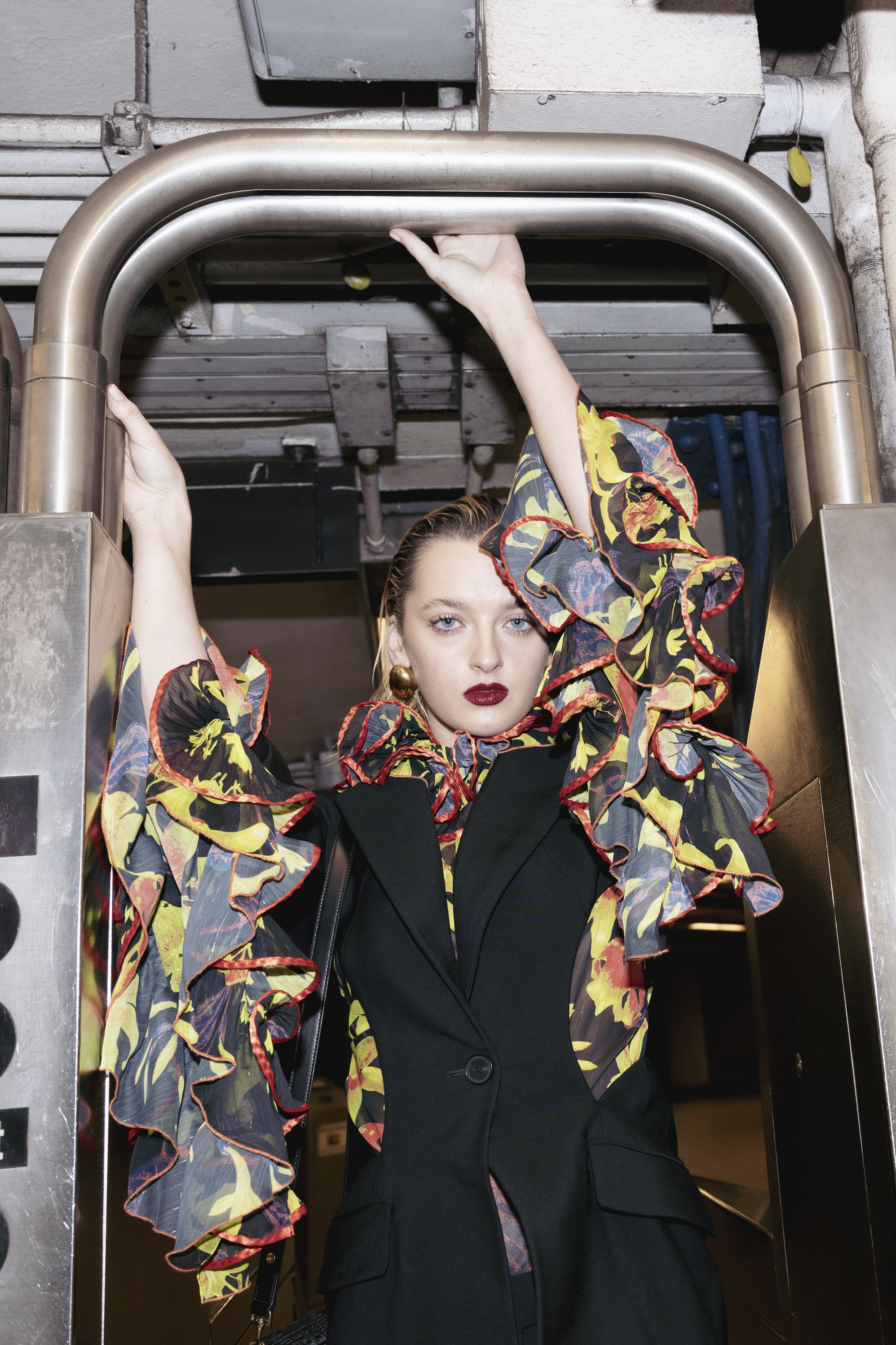 Alexander McQueen Jacket $ 3,990, Alexander McQueen Trousers $1,390; Alexandermcqueen.com & Alexander McQueen Soho (332) 214-7080; Christopher John Rogers Shirt; Simplicite Earrings; Porte & Paire Loafers