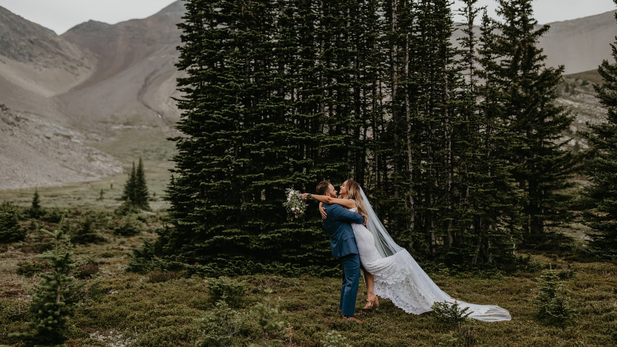 “We initially wanted to bring a commissioner on a hike and get married at one of our favorite lookouts in Kananaskis, but the issue came up of how sweaty we would be, and we want to remember this moment while not looking like slobs. We ended up renting a helicopter to take us on a short flight into the Rockies just north of Canmore and Kananaskis and southeast of Banff National Park to a mountain called Mount Charles Stewart. Flying with us was our commissioner, two of my friends as witnesses, and our photographer. The day was perfect, quiet, private, and intimate. Looking back, I don’t think we would have changed anything. We saved all the money from the larger wedding and put it directly into a house. There wasn’t any debt after the elopement, just memories and a satisfaction that we did the right thing by us. It was the perfect day, perfect process, and perfect solution for us.” —Shane Budish