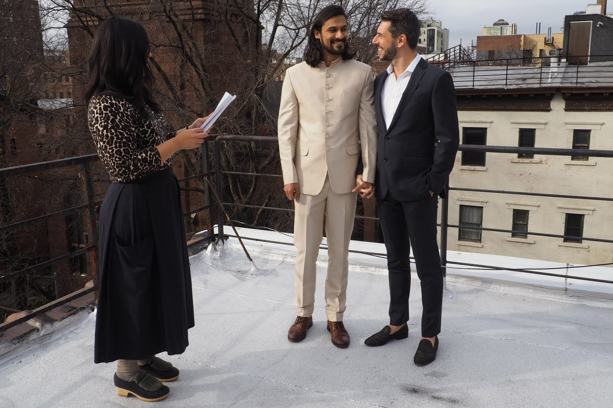 “After months of foolishly thinking we had done everything correctly and understood the labyrinth of the French state, we were sitting in the Paris apartment of Jeremy’s parents, and it became clear that our timeline for marriage, coupled with the visas I needed, was laughably optimistic. Jeremy was flying to New York in less than two weeks to be with me while movers loaded my belongings on a boat to France, and I celebrated a decade in the city before moving. Mary and Thierry, Jeremy’s parents, saw that there was only one way through the latest logistical hurdle of love and said, ‘Just get married next week in New York.’ The next day we went with friends to a jewelry shop in Paris and bought our rings. A week later, with everything from my apartment moved out the day before, we got married on Dave’s roof in Brooklyn by our internet-ordained friend and three close loves. Our reception consisted of champagne (proper) out of Dixie cups served on a suitcase and lunch at the neighborhood’s staple diner across the street.”
