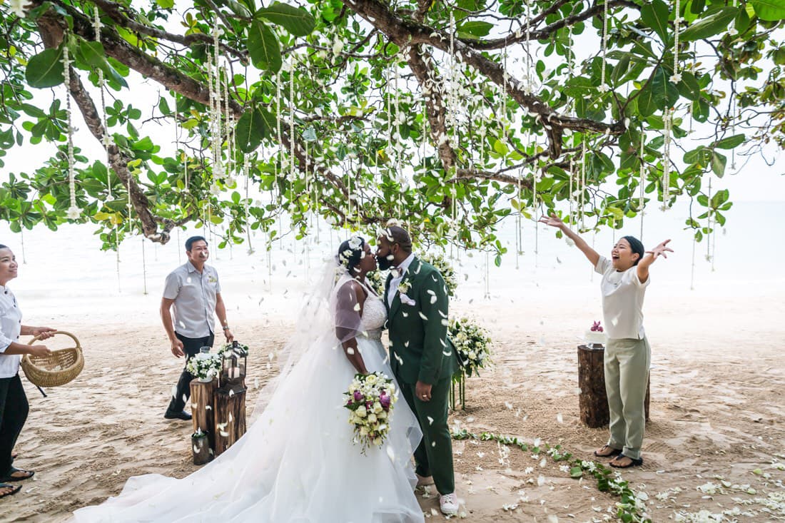 “Our wedding was amazing, beautiful. Ariel rode an elephant down the aisle—an entrance dreams are made of. Our photographer, Kelly Williams, was the only one to travel with us from New York, and she proved to be our best investment. The whole day, down to our dinner in front of a waterfall in the Thai jungle, was breathtaking, peaceful, and an experience that we couldn’t have thought we’d do. We wouldn’t change a thing about our choice. Even today, with more money available, we’d do everything just about the same.”