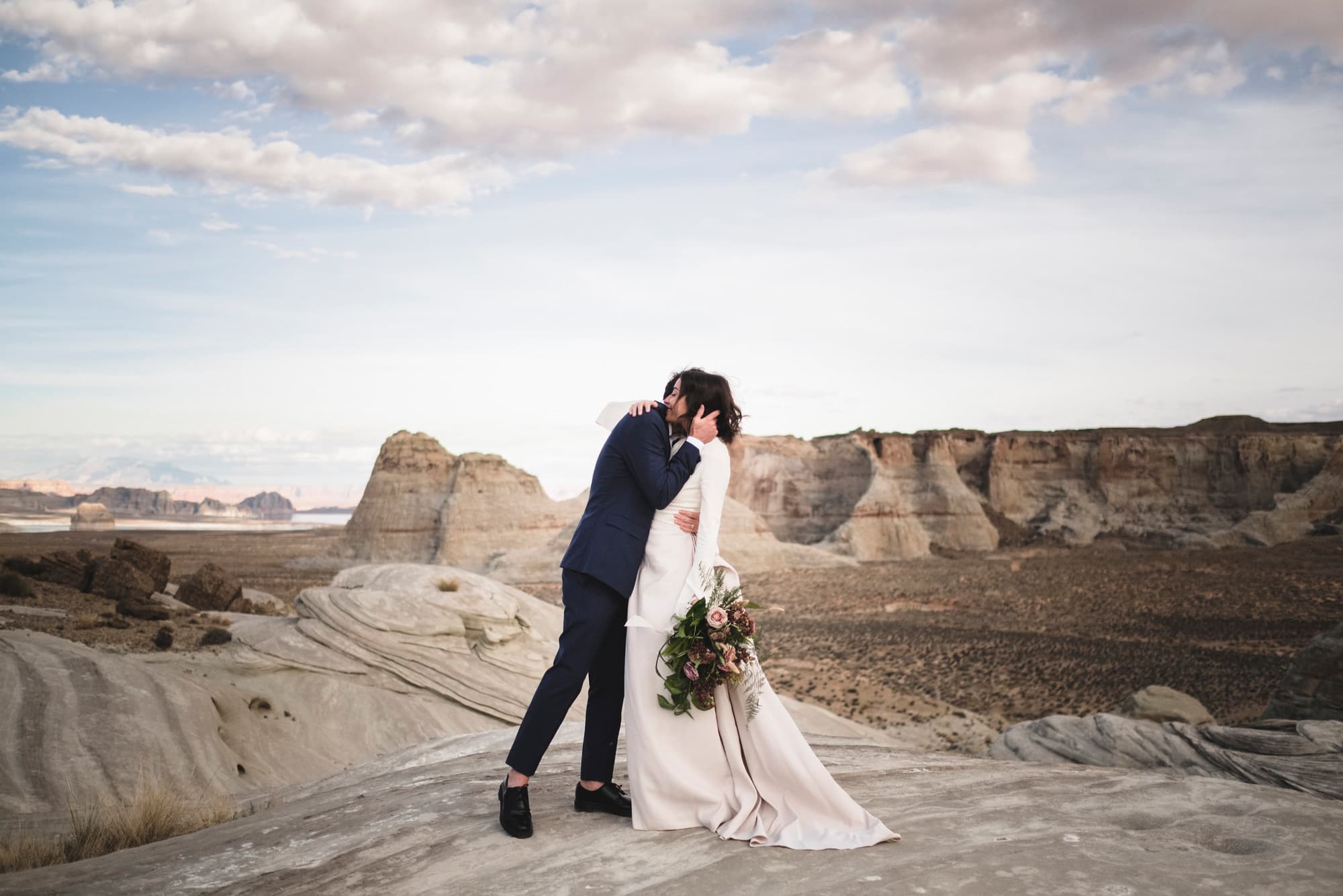 “I always thought I would elope or do the city hall thing if I got married—I have no idea why. Once Justin and I got engaged, we looked at all the options—ceremony, dinner, dancing, city hall, just a dinner—but we kept coming back to just wanting to do something ourselves. We got our families’ blessing, and the next step was just figuring out where. Once you take the guests out, literally anything is possible. So with that in mind, we chose to get married at Amangiri in Utah. It’s magical and otherworldly and something I wouldn’t have been able to rationalize if we weren’t getting married. We had six weeks to plan, and I bought everything, including my dress, online. We found a florist in Salt Lake City and had her drive my bouquet down that morning, and we flew a photographer in so we could have a lot of pictures to show our families. The ceremony itself was about six minutes—a traditional Navajo sand ceremony at sunset. We had an epic under-the-stars private dinner that night in the middle of the desert and flew home to New York five days later. Before going home, we mailed postcards to all our friends and family letting them knew we eloped and we loved them and wished they could have been there. I smile every time I think about it.” —