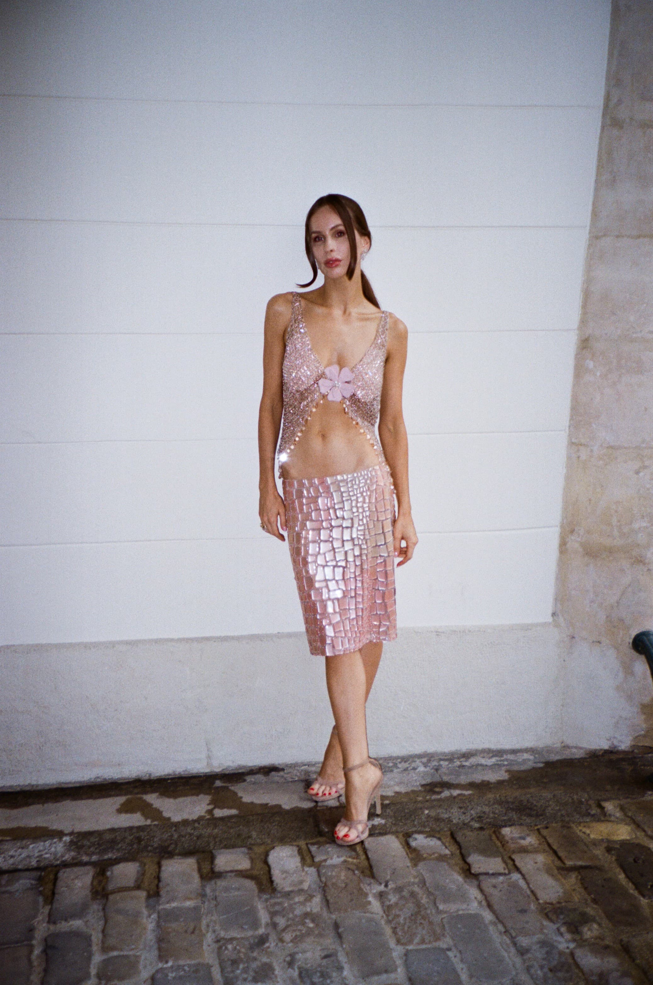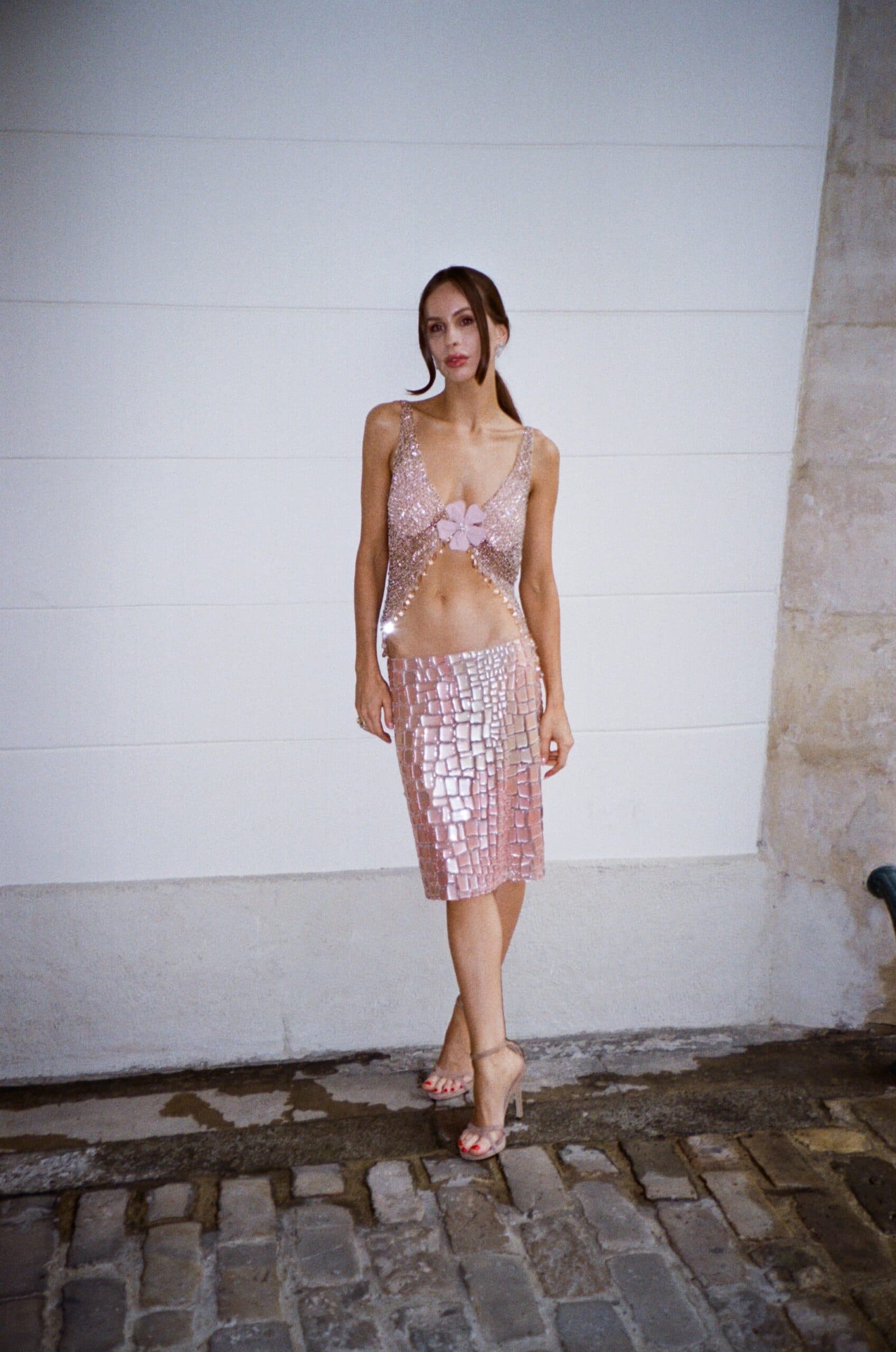 After two weeks of heatstroke in Paris, the rain decided to come in full force. Naturally, it was the day I wore the most summer-appropriate look head-to-toe in sparkling pink Georges Hobeika Spring/Summer 2025 with C Heinrich Diamonds. I arrived at the Bourse, where the collection leaned heavily into romanticism: pearl-adorned gowns, champagne tones, sculpted silhouettes.