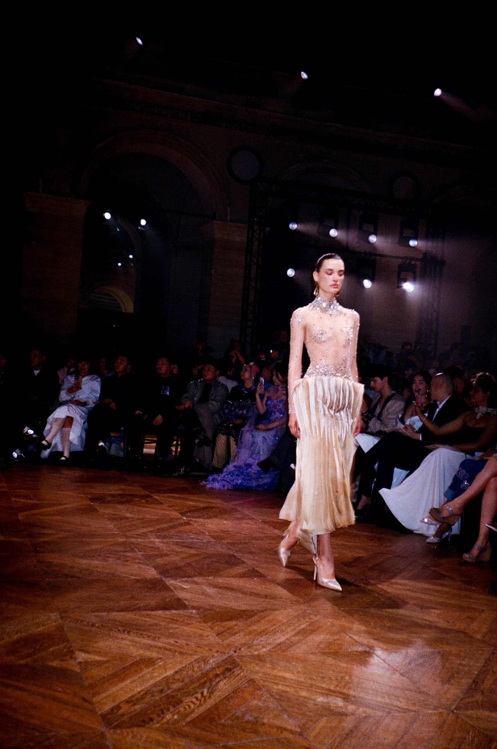 My phone is always in hand, capturing close-ups and movement in every look, all sent in real-time to clients across time zones. One standout: a sheer, crystal-studded high-neck bodice paired with a sculptural pleated gold skirt, already mentally styled for a Monaco client’s autumn gala before the model even exited the runway.