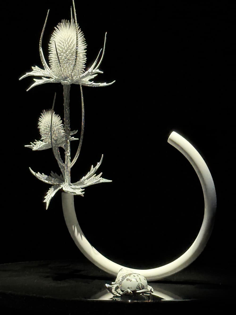 Themes of nature continued across town at Boucheron, where the Impermanence collection interpreted fleeting botanical forms across 28 couture sets. A caterpillar and butterfly brooch, a cyclamen bracelet, and an oat-leaf headpiece together valued at €2.1 million, which took over 4,279 hours to create, each surface encrusted in diamonds. Who needs florals for spring when you have diamond leaves?