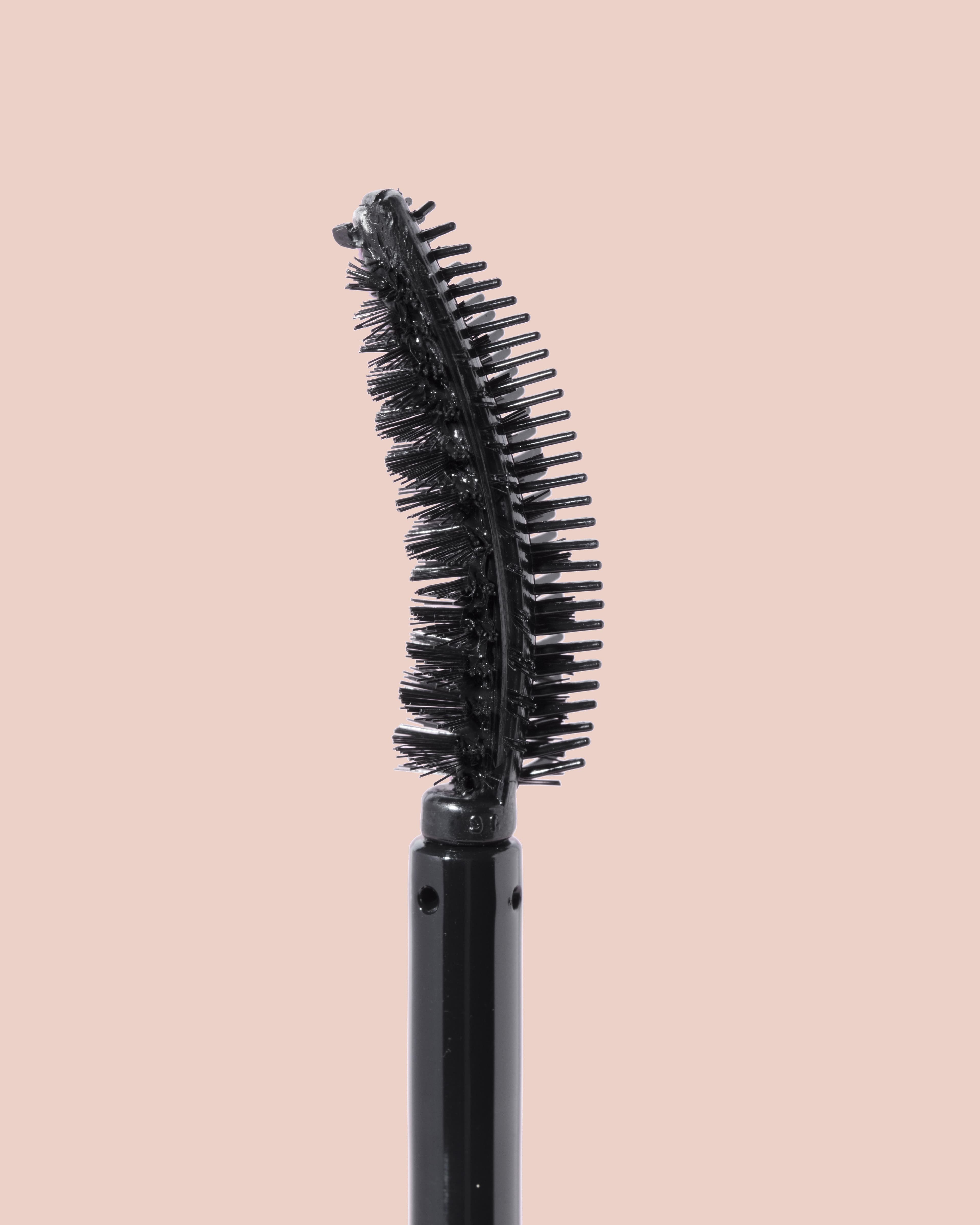 The brush is dual-sided: On one side of the wand, you'll find a double-rowed silicone comb that deposits the glossy black formula at the base of your lashes to create volume, and on the other side, there are fiber bristles that lift your lashes from the root and comb through them to create a voluminous, fanned-out effect.