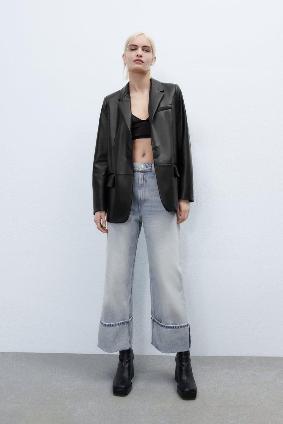 Despite the bright hue, the bulk of these elements are rather simple: a knit midi dress and a leather blazer. Therefore, the black-and-white boots add intrigue without clashing too aggressively with the other items at play.