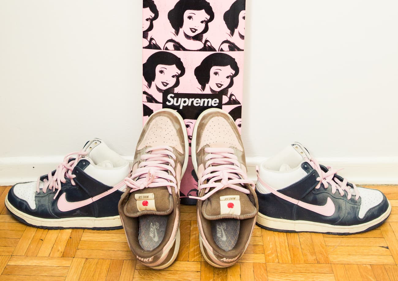 “I keep half of my sneakers at home and half of them at my office because I don’t have enough room in my apartment for all of them! I keep them in my closet and hallway at home and I’m not too picky about how they’re stored. I only stuff the toes of my sneakers that don’t keep their structure very well. At work, most of them are under my desk and some are in boxes. I used to throw away all my shoe boxes but some of them are really nice, so it’s hard to part with them. Ideally I’ll have a big enough place to store them on shelves on a wall, kind of like a sneaker store!”