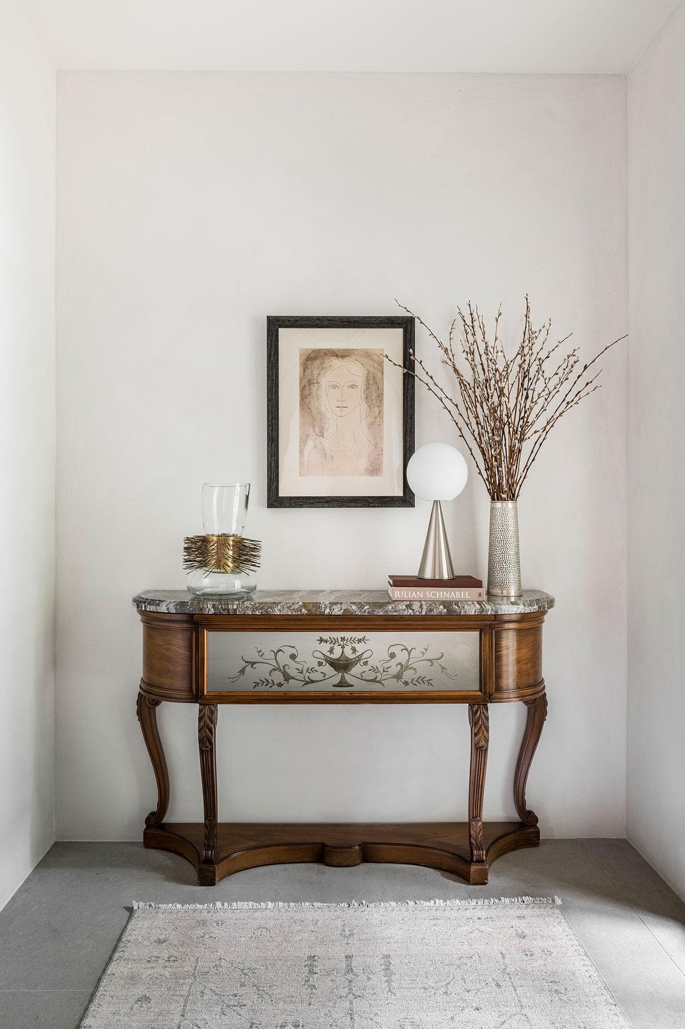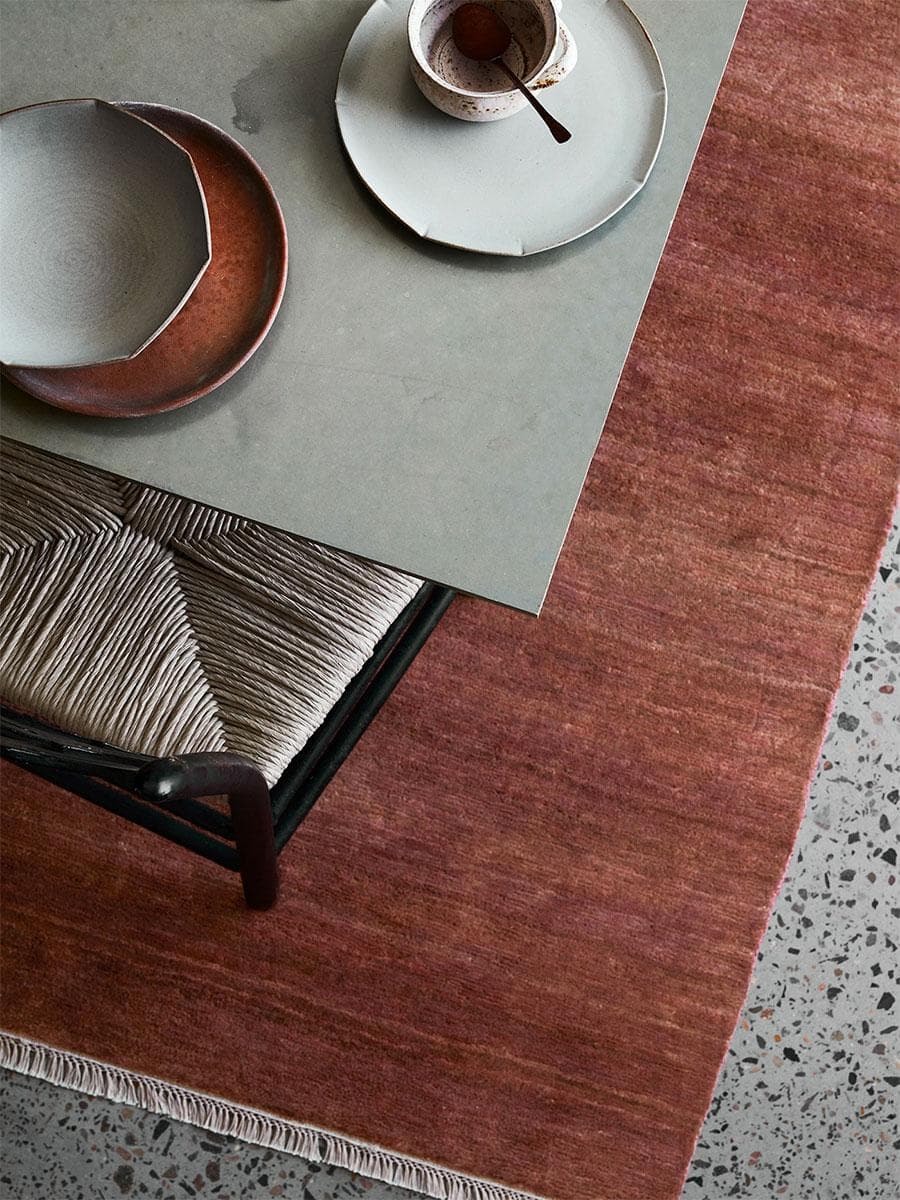 "Rugs work well with any surface, but when choosing the type of rug for your flooring, I think it's important to look at how smooth or irregular the surface of the flooring is. For example, a cleft tile would probably read best under a heavier-pile rug, while a Kilim can look great over a smooth wood floor." —CC