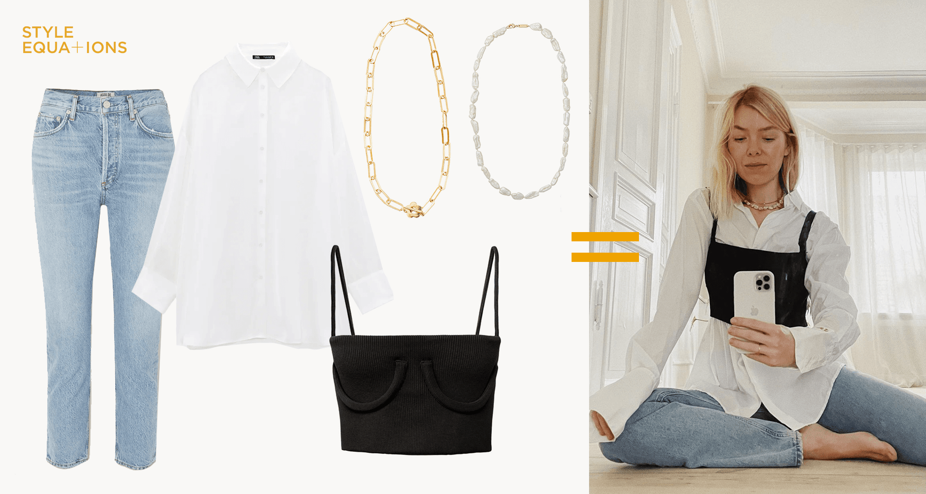 Right photo: Courtesy of Instagram/@josephineaarkroghAn example of a year-round style pairing, layer a knit crop top over a more boxy white button-down for an intriguing contrast in proportions. A dash of blue denim softens the stark black and white.