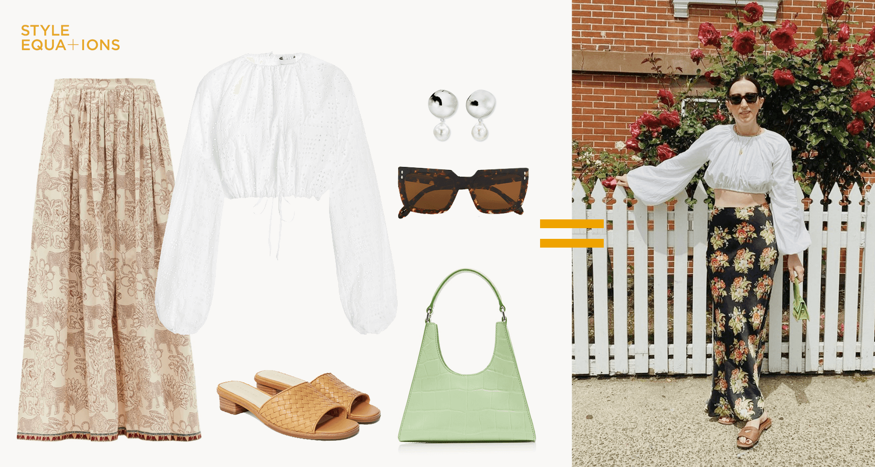 Right photo: Courtesy of Instagram/@caitlinburkenycWhether you are on island time mentally or physically, a printed full skirt is always a good idea. The simple white top and leather slides ground the look while sculptural jewelry adds a little playfulness.