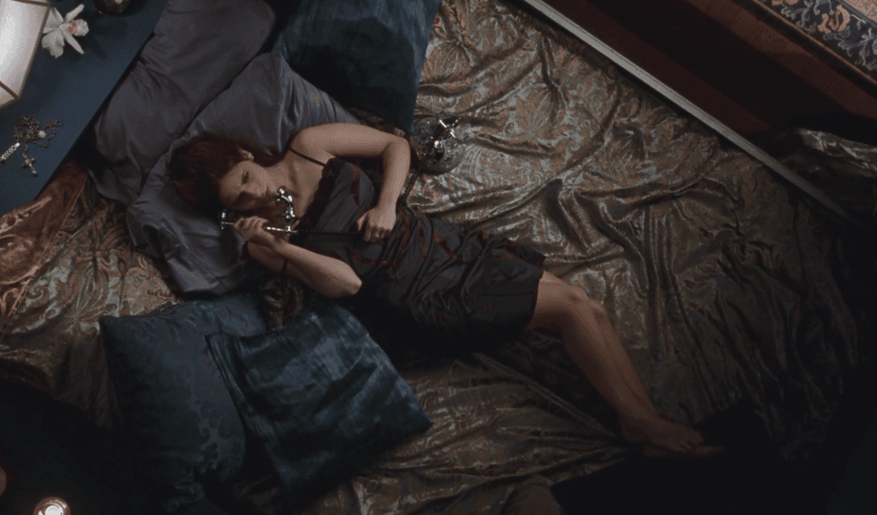 When we meet Kathryn Merteuil lounging in her luxurious and decadent Manhattan home wearing a black corset top with ruched detailing—underneath a Dolce & Gabbana suit, nonetheless. The entire color palette, save from the bust of her top, is dark and, to be fair, so is her energy. As a viewer, it's easy to immediately clock Kathryn as manipulative and a lover of scheming. From a fashion perspective, I immediately appreciate the dichotomy: a sophisticated power suit on top, a seductive surprise underneath.
